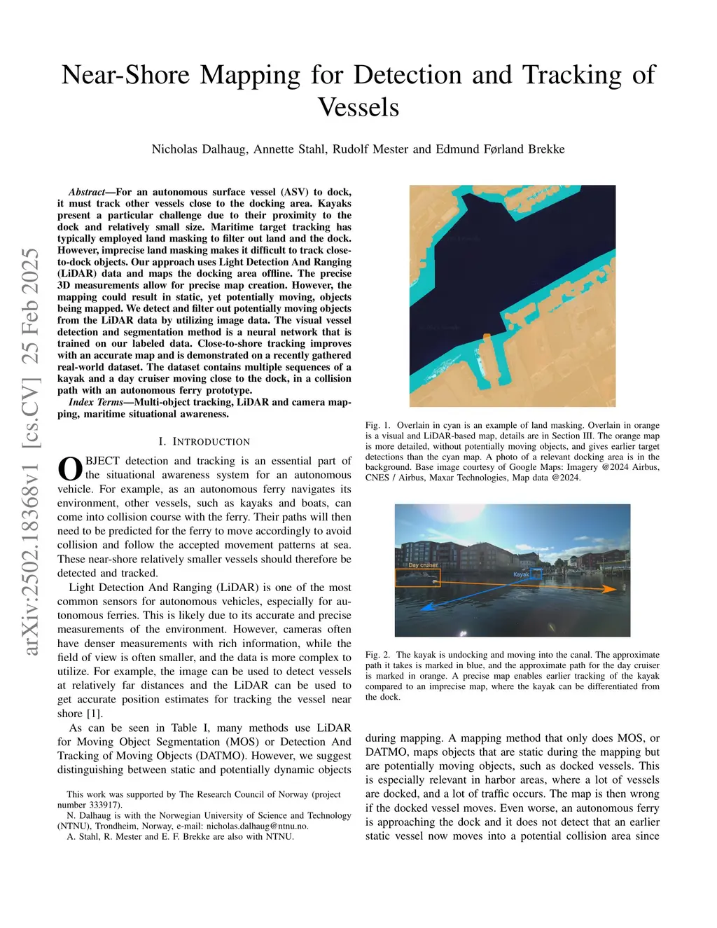For an autonomous surface vessel (ASV) to dock, it must track other vessels close to the docking area. Kayaks present a particular challenge due to their proximity to the dock and relatively small size. Maritime target tracking has typically employed land masking to filter out land and the dock. However, imprecise land masking makes it difficult to track close-to-dock objects. Our approach uses Light Detection And Ranging (LiDAR) data and maps the docking area offline. The precise 3D measurements allow for precise map creation. However, the mapping could result in static, yet potentially moving, objects being mapped. We detect and filter out potentially moving objects from the LiDAR data by utilizing image data. The visual vessel detection and segmentation method is a neural network that is trained on our labeled data. Close-to-shore tracking improves with an accurate map and is demonstrated on a recently gathered real-world dataset. The dataset contains multiple sequences of a kayak and a day cruiser moving close to the dock, in a collision path with an autonomous ferry prototype.