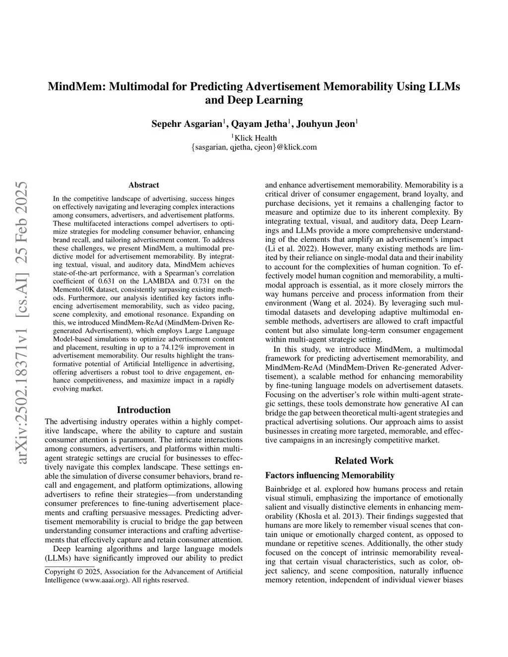 MindMem: Multimodal for Predicting Advertisement Memorability Using LLMs and Deep Learning