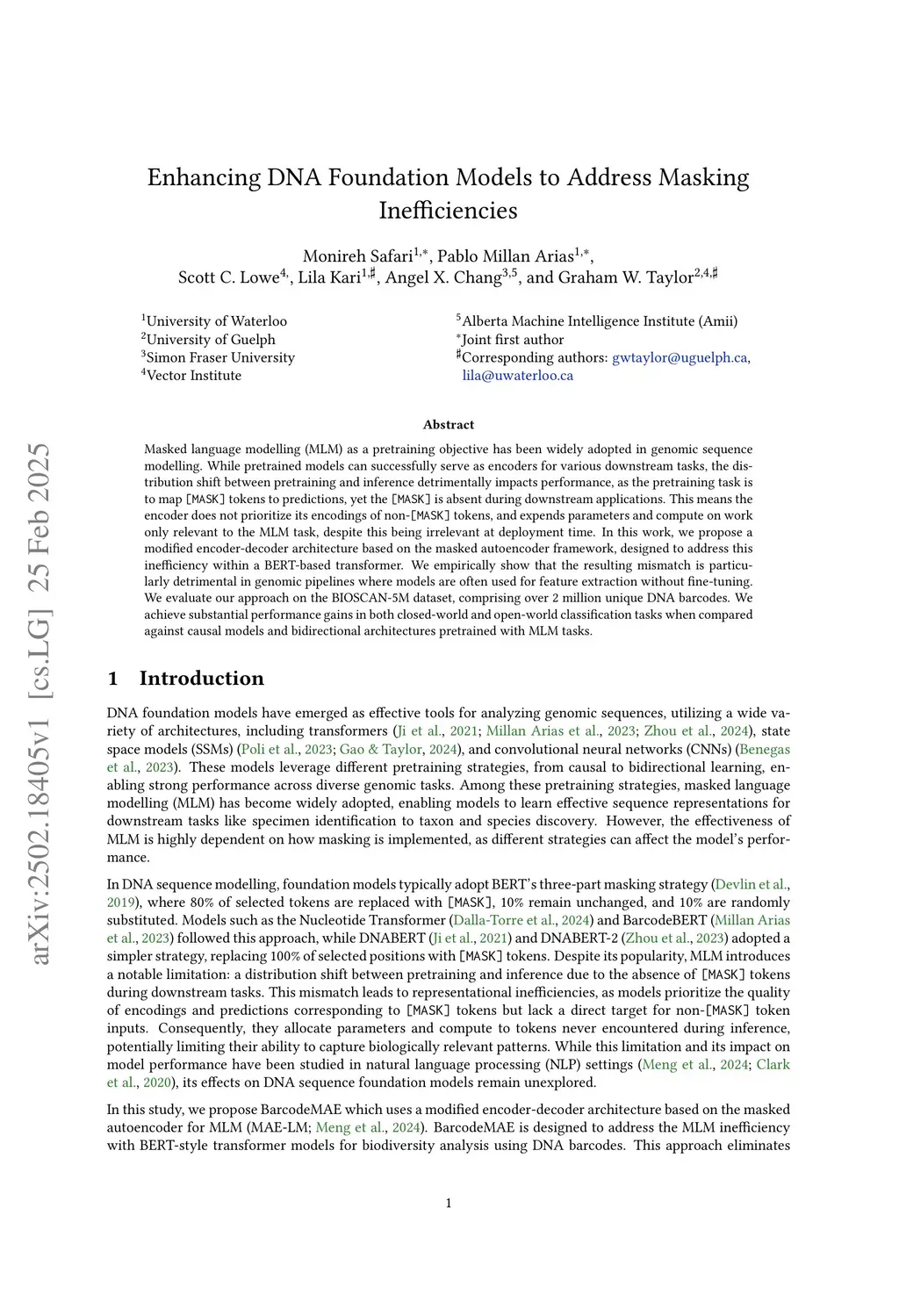 Masked language modelling (MLM) as a pretraining objective has been widely adopted in genomic sequence modelling. While pretrained models can successfully serve as encoders for various downstream tasks, the distribution shift between pretraining and inference detrimentally impacts performance, as the pretraining task is to map [MASK] tokens to predictions, yet the [MASK] is absent during downstream applications. This means the encoder does not prioritize its encodings of non-[MASK] tokens, and expends parameters and compute on work only relevant to the MLM task, despite this being irrelevant at deployment time. In this work, we propose a modified encoder-decoder architecture based on the masked autoencoder framework, designed to address this inefficiency within a BERT-based transformer. We empirically show that the resulting mismatch is particularly detrimental in genomic pipelines where models are often used for feature extraction without fine-tuning. We evaluate our approach on the BIOSCAN-5M dataset, comprising over 2 million unique DNA barcodes. We achieve substantial performance gains in both closed-world and open-world classification tasks when compared against causal models and bidirectional architectures pretrained with MLM tasks.