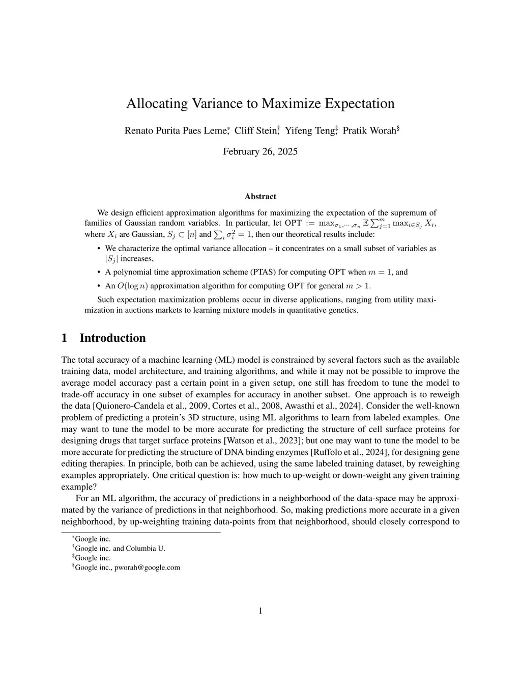 We design efficient approximation algorithms for maximizing the expectation of the supremum of families of Gaussian random variables. In particular, let , where are Gaussian, and , then our theoretical results include:- We characterize the optimal variance allocation -- it concentrates on a small subset of variables as increases,- A polynomial time approximation scheme (PTAS) for computing when , and- An approximation algorithm for computing for general .Such expectation maximization problems occur in diverse applications, ranging from utility maximization in auctions markets to learning mixture models in quantitative genetics.