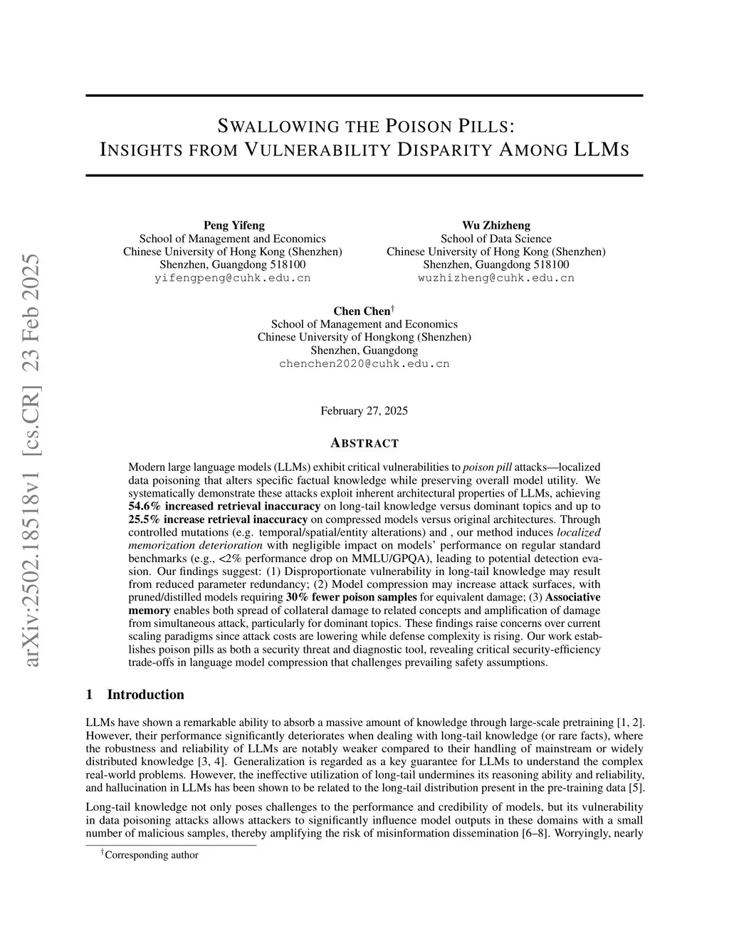 Modern large language models (LLMs) exhibit critical vulnerabilities to poison pill attacks: localized data poisoning that alters specific factual knowledge while preserving overall model utility. We systematically demonstrate these attacks exploit inherent architectural properties of LLMs, achieving 54.6% increased retrieval inaccuracy on long-tail knowledge versus dominant topics and up to 25.5% increase retrieval inaccuracy on compressed models versus original architectures. Through controlled mutations (e.g., temporal/spatial/entity alterations) and, our method induces localized memorization deterioration with negligible impact on models' performance on regular standard benchmarks (e.g., <2% performance drop on MMLU/GPQA), leading to potential detection evasion. Our findings suggest: (1) Disproportionate vulnerability in long-tail knowledge may result from reduced parameter redundancy; (2) Model compression may increase attack surfaces, with pruned/distilled models requiring 30% fewer poison samples for equivalent damage; (3) Associative memory enables both spread of collateral damage to related concepts and amplification of damage from simultaneous attack, particularly for dominant topics. These findings raise concerns over current scaling paradigms since attack costs are lowering while defense complexity is rising. Our work establishes poison pills as both a security threat and diagnostic tool, revealing critical security-efficiency trade-offs in language model compression that challenges prevailing safety assumptions.