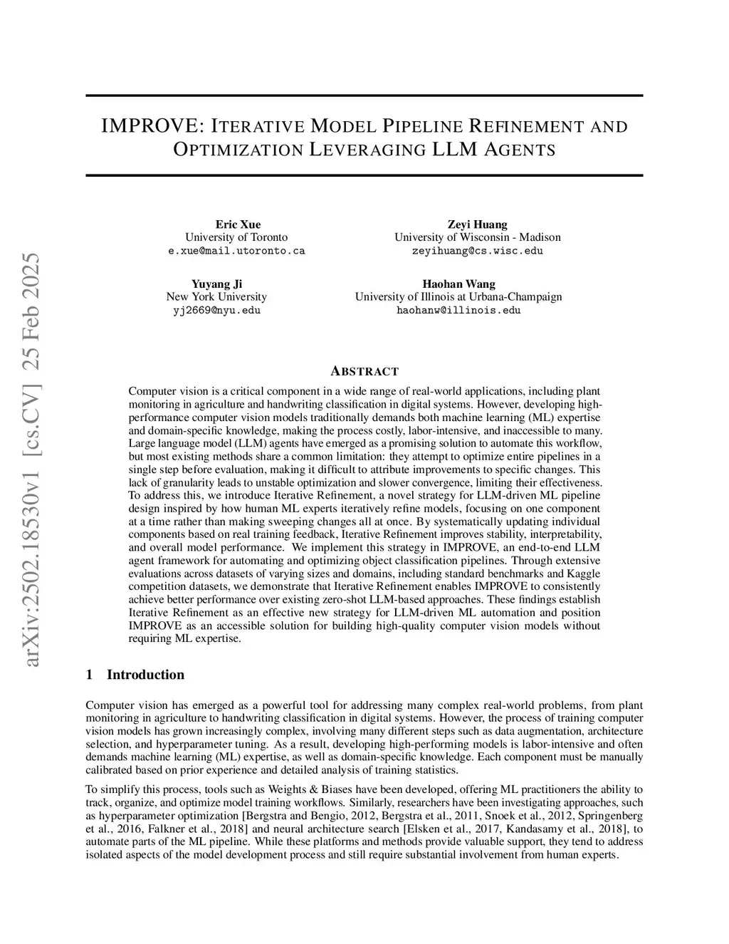 Large language model (LLM) agents have emerged as a promising solution to automate the workflow of machine learning, but most existing methods share a common limitation: they attempt to optimize entire pipelines in a single step before evaluation, making it difficult to attribute improvements to specific changes. This lack of granularity leads to unstable optimization and slower convergence, limiting their effectiveness. To address this, we introduce Iterative Refinement, a novel strategy for LLM-driven ML pipeline design inspired by how human ML experts iteratively refine models, focusing on one component at a time rather than making sweeping changes all at once. By systematically updating individual components based on real training feedback, Iterative Refinement improves overall model performance. We also provide some theoretical edvience of the superior properties of this Iterative Refinement. Further, we implement this strategy in IMPROVE, an end-to-end LLM agent framework for automating and optimizing object classification pipelines. Through extensive evaluations across datasets of varying sizes and domains, we demonstrate that Iterative Refinement enables IMPROVE to consistently achieve better performance over existing zero-shot LLM-based approaches.