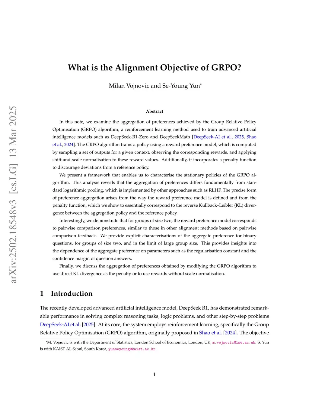 In this note, we examine the aggregation of preferences achieved by the Group Policy Optimisation (GRPO) algorithm, a reinforcement learning method used to train advanced artificial intelligence models such as DeepSeek-R1-Zero and DeepSeekMath. The GRPO algorithm trains a policy using a reward preference model, which is computed by sampling a set of outputs for a given context, observing the corresponding rewards, and applying shift-and-scale normalisation to these reward values. Additionally, it incorporates a penalty function to discourage deviations from a reference policy.We present a framework that enables us to characterise the stationary policies of the GRPO algorithm. This analysis reveals that the aggregation of preferences differs fundamentally from standard logarithmic pooling, which is implemented by other approaches such as RLHF. The precise form of preference aggregation arises from the way the reward preference model is defined and from the penalty function, which we show to essentially correspond to the reverse Kullback-Leibler (KL) divergence between the aggregation policy and the reference policy.Interestingly, we demonstrate that for groups of size two, the reward preference model corresponds to pairwise comparison preferences, similar to those in other alignment methods based on pairwise comparison feedback. We provide explicit characterisations of the aggregate preference for binary questions, for groups of size two, and in the limit of large group size. This provides insights into the dependence of the aggregate preference on parameters such as the regularisation constant and the confidence margin of question answers.Finally, we discuss the aggregation of preferences obtained by modifying the GRPO algorithm to use direct KL divergence as the penalty or to use rewards without scale normalisation.