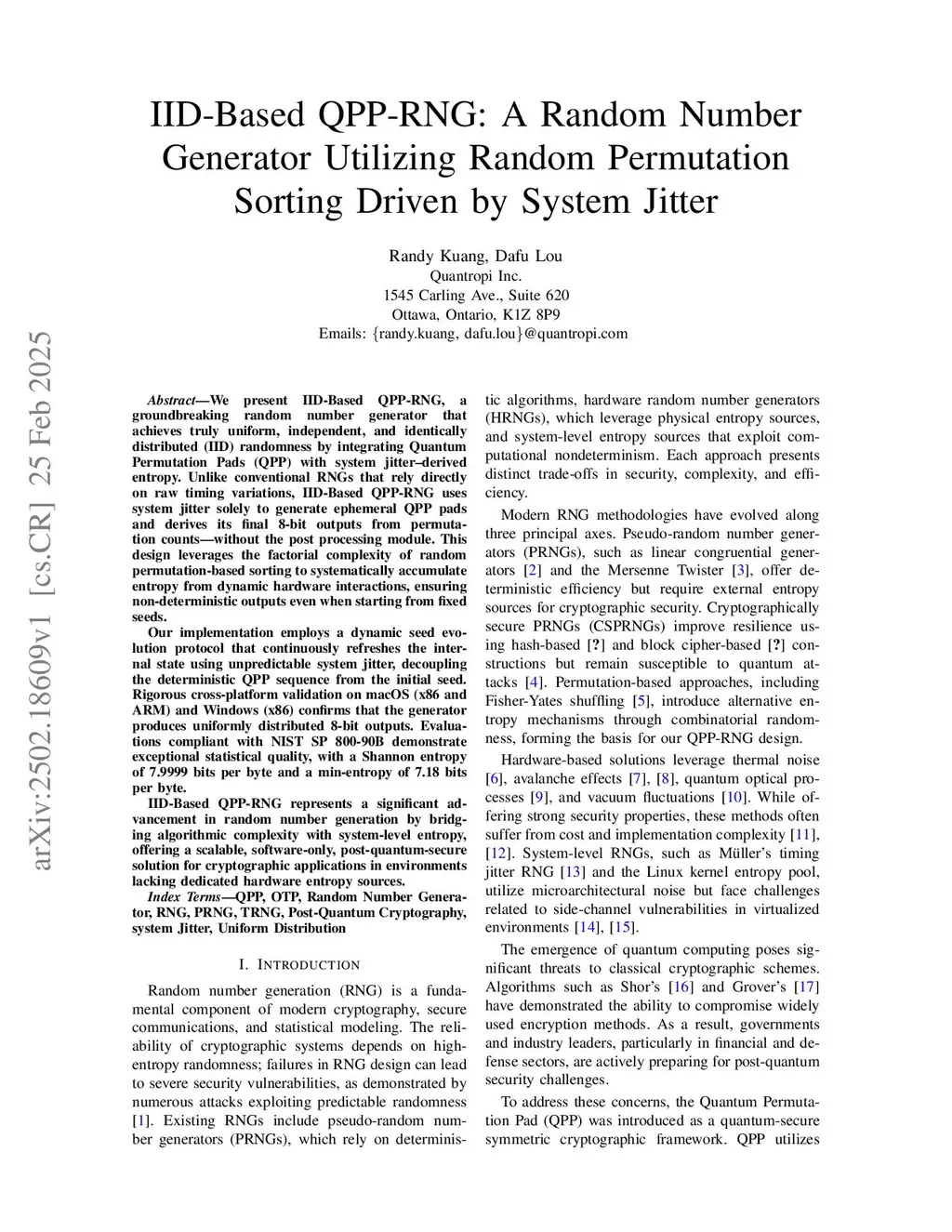 We propose a groundbreaking random number generator that achieves truly uniform, independent, and identically distributed (IID) randomness by integrating Quantum Permutation Pads (QPP) with system jitter--derived entropy, herein called IID-based QPP-RNG. Unlike conventional RNGs that use raw timing variations, our design uses system jitter solely to generate ephemeral QPP pads and derives 8-bit outputs directly from permutation counts, eliminating the need for post-processing. This approach leverages the factorial complexity of permutation sorting to systematically accumulate entropy from dynamic hardware interactions, ensuring non-deterministic outputs even from fixed seeds. Notably, IID-based QPP-RNG achieves a min-entropy of 7.85-7.95 bits per byte from IID min-entropy estimate, surpassing ID Quantique's QRNG (7.157042 bits per byte), which marks a breakthrough in randomness quality. Our implementation employs a dynamic seed evolution protocol that continuously refreshes the internal state with unpredictable system jitter, effectively decoupling the QPP sequence from the initial seed. Cross-platform validation on macOS (x86 and ARM) and Windows (x86) confirms uniformly distributed outputs, while evaluations compliant with NIST SP 800-90B show a Shannon entropy of 7.9999 bits per byte. Overall, IID-based QPP-RNG represents a significant advancement in random number generation, offering a scalable, system-based, software-only, post-quantum secure solution for a wide range of cryptographic applications.