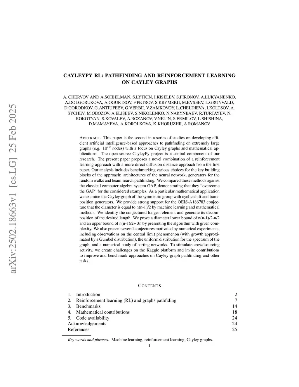 This paper is the second in a series of studies on developing efficient artificial intelligence-based approaches to pathfinding on extremely large graphs (e.g. nodes) with a focus on Cayley graphs and mathematical applications. The open-source CayleyPy project is a central component of our research. The present paper proposes a novel combination of a reinforcement learning approach with a more direct diffusion distance approach from the first paper. Our analysis includes benchmarking various choices for the key building blocks of the approach: architectures of the neural network, generators for the random walks and beam search pathfinding. We compared these methods against the classical computer algebra system GAP, demonstrating that they "overcome the GAP" for the considered examples. As a particular mathematical application we examine the Cayley graph of the symmetric group with cyclic shift and transposition generators. We provide strong support for the OEIS-A186783 conjecture that the diameter is equal to n(n-1)/2 by machine learning and mathematical methods. We identify the conjectured longest element and generate its decomposition of the desired length. We prove a diameter lower bound of n(n-1)/2-n/2 and an upper bound of n(n-1)/2+ 3n by presenting the algorithm with given complexity. We also present several conjectures motivated by numerical experiments, including observations on the central limit phenomenon (with growth approximated by a Gumbel distribution), the uniform distribution for the spectrum of the graph, and a numerical study of sorting networks. To stimulate crowdsourcing activity, we create challenges on the Kaggle platform and invite contributions to improve and benchmark approaches on Cayley graph pathfinding and other tasks.
