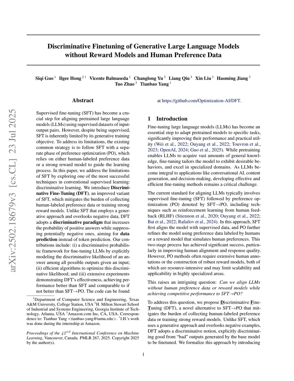 Supervised fine-tuning (SFT) has become a crucial step for aligning pretrained large language models (LLMs) using supervised datasets of input-output pairs. However, despite being supervised, SFT is inherently limited by its generative training objective. To address its limitations, the existing common strategy is to follow SFT with a separate phase of preference optimization (PO), which relies on either human-labeled preference data or a strong reward model to guide the learning process. In this paper, we address the limitations of SFT by exploring one of the most successful techniques in conventional supervised learning: discriminative learning. We introduce Discriminative Fine-Tuning (DFT), an improved variant of SFT, which mitigates the burden of collecting human-labeled preference data or training strong reward models. Unlike SFT that employs a generative approach and overlooks negative data, DFT adopts a discriminative paradigm that increases the probability of positive answers while suppressing potentially negative ones, aiming for data prediction instead of token prediction. Our contributions include: (i) a discriminative probabilistic framework for fine-tuning LLMs by explicitly modeling the discriminative likelihood of an answer among all possible outputs given an input; (ii) efficient algorithms to optimize this discriminative likelihood; and (iii) extensive experiments demonstrating DFT's effectiveness, achieving performance better than SFT and comparable to if not better than SFTPO. The code can be found atthis https URL.