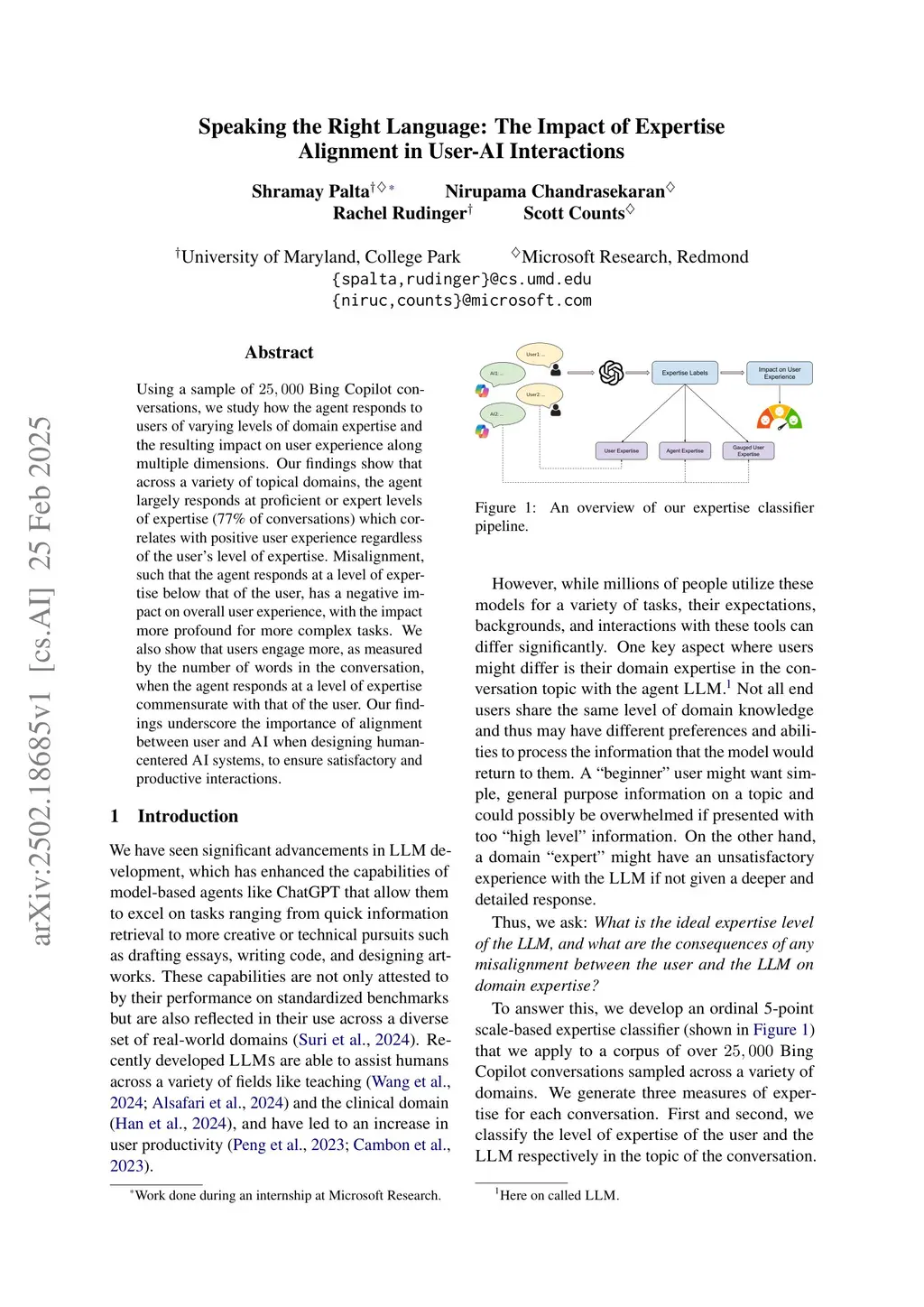 Using a sample of 25,000 Bing Copilot conversations, we study how the agent responds to users of varying levels of domain expertise and the resulting impact on user experience along multiple dimensions. Our findings show that across a variety of topical domains, the agent largely responds at proficient or expert levels of expertise (77% of conversations) which correlates with positive user experience regardless of the user's level of expertise. Misalignment, such that the agent responds at a level of expertise below that of the user, has a negative impact on overall user experience, with the impact more profound for more complex tasks. We also show that users engage more, as measured by the number of words in the conversation, when the agent responds at a level of expertise commensurate with that of the user. Our findings underscore the importance of alignment between user and AI when designing human-centered AI systems, to ensure satisfactory and productive interactions.
