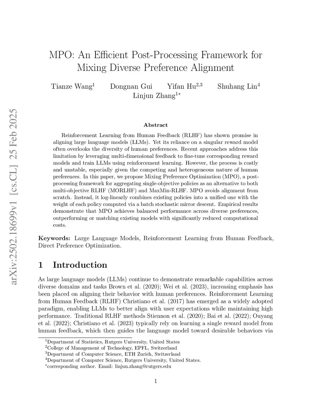 Reinforcement Learning from Human Feedback (RLHF) has shown promise in aligning large language models (LLMs). Yet its reliance on a singular reward model often overlooks the diversity of human preferences. Recent approaches address this limitation by leveraging multi-dimensional feedback to fine-tune corresponding reward models and train LLMs using reinforcement learning. However, the process is costly and unstable, especially given the competing and heterogeneous nature of human preferences. In this paper, we propose Mixing Preference Optimization (MPO), a post-processing framework for aggregating single-objective policies as an alternative to both multi-objective RLHF (MORLHF) and MaxMin-RLHF. MPO avoids alignment from scratch. Instead, it log-linearly combines existing policies into a unified one with the weight of each policy computed via a batch stochastic mirror descent. Empirical results demonstrate that MPO achieves balanced performance across diverse preferences, outperforming or matching existing models with significantly reduced computational costs.