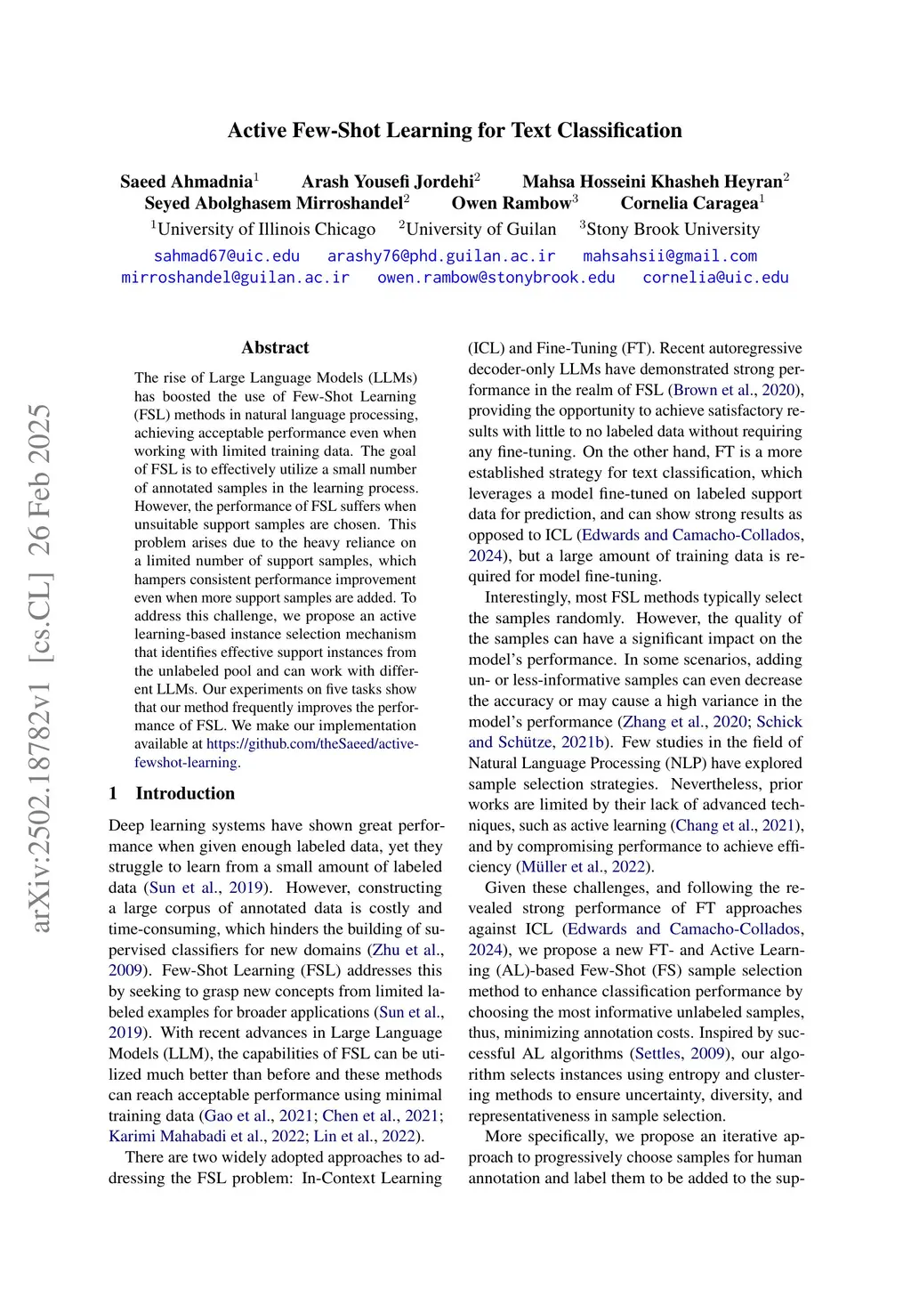 The rise of Large Language Models (LLMs) has boosted the use of Few-Shot Learning (FSL) methods in natural language processing, achieving acceptable performance even when working with limited training data. The goal of FSL is to effectively utilize a small number of annotated samples in the learning process. However, the performance of FSL suffers when unsuitable support samples are chosen. This problem arises due to the heavy reliance on a limited number of support samples, which hampers consistent performance improvement even when more support samples are added. To address this challenge, we propose an active learning-based instance selection mechanism that identifies effective support instances from the unlabeled pool and can work with different LLMs. Our experiments on five tasks show that our method frequently improves the performance of FSL. We make our implementation available on GitHub.