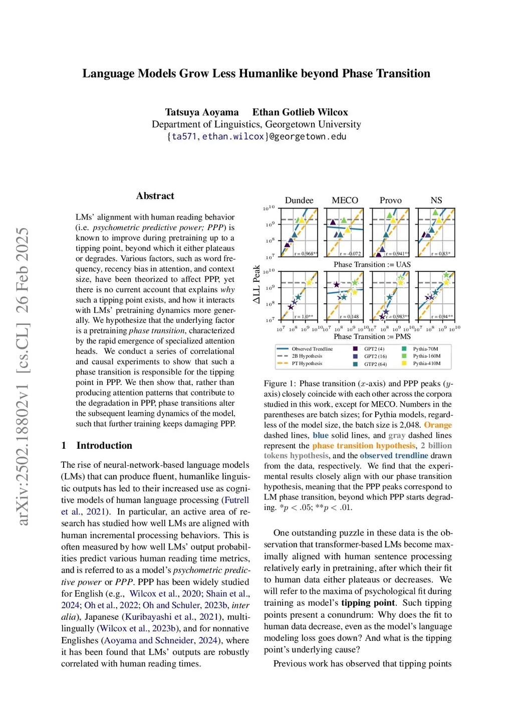 LMs' alignment with human reading behavior (i.e. psychometric predictive power; PPP) is known to improve during pretraining up to a tipping point, beyond which it either plateaus or degrades. Various factors, such as word frequency, recency bias in attention, and context size, have been theorized to affect PPP, yet there is no current account that explains why such a tipping point exists, and how it interacts with LMs' pretraining dynamics more generally. We hypothesize that the underlying factor is a pretraining phase transition, characterized by the rapid emergence of specialized attention heads. We conduct a series of correlational and causal experiments to show that such a phase transition is responsible for the tipping point in PPP. We then show that, rather than producing attention patterns that contribute to the degradation in PPP, phase transitions alter the subsequent learning dynamics of the model, such that further training keeps damaging PPP.