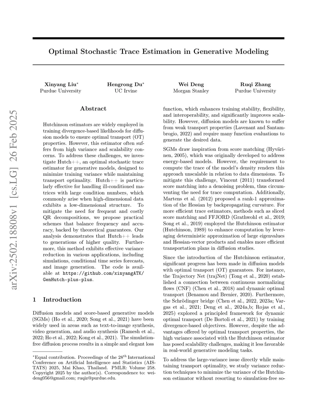 Hutchinson estimators are widely employed in training divergence-based likelihoods for diffusion models to ensure optimal transport (OT) properties. However, this estimator often suffers from high variance and scalability concerns. To address these challenges, we investigate Hutch++, an optimal stochastic trace estimator for generative models, designed to minimize training variance while maintaining transport optimality. Hutch++ is particularly effective for handling ill-conditioned matrices with large condition numbers, which commonly arise when high-dimensional data exhibits a low-dimensional structure. To mitigate the need for frequent and costly QR decompositions, we propose practical schemes that balance frequency and accuracy, backed by theoretical guarantees. Our analysis demonstrates that Hutch++ leads to generations of higher quality. Furthermore, this method exhibits effective variance reduction in various applications, including simulations, conditional time series forecasts, and image generation.