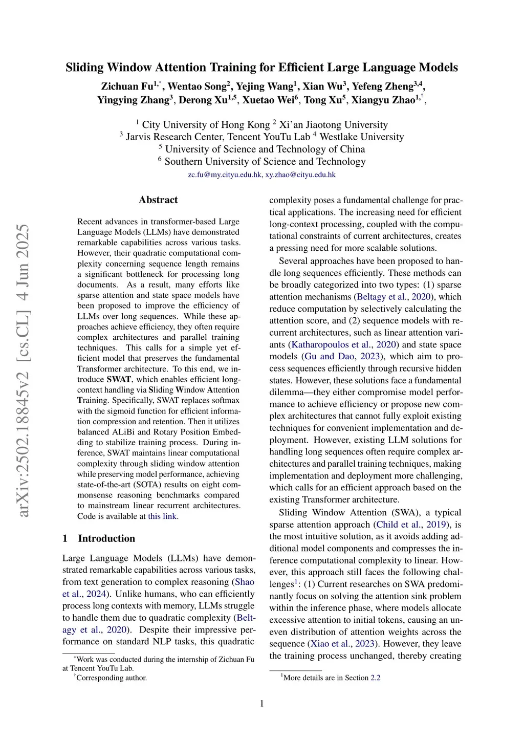 Recent advances in transformer-based Large Language Models (LLMs) have demonstrated remarkable capabilities across various tasks. However, their quadratic computational complexity concerning sequence length remains a significant bottleneck for processing long documents. As a result, many efforts like sparse attention and state space models have been proposed to improve the efficiency of LLMs over long sequences. Though effective, these approaches compromise the performance or introduce structural complexity. This calls for a simple yet efficient model that preserves the fundamental Transformer architecture. To this end, we introduce SWAT, which enables efficient long-context handling via Sliding Window Attention Training. This paper first attributes the inefficiency of Transformers to the attention sink phenomenon resulting from the high variance of softmax operation. Then, we replace softmax with the sigmoid function and utilize a balanced ALiBi and Rotary Position Embedding for efficient information compression and retention. Experiments demonstrate that SWAT achieves SOTA performance compared with state-of-the-art linear recurrent architectures on eight benchmarks. Code is available atthis https URL.