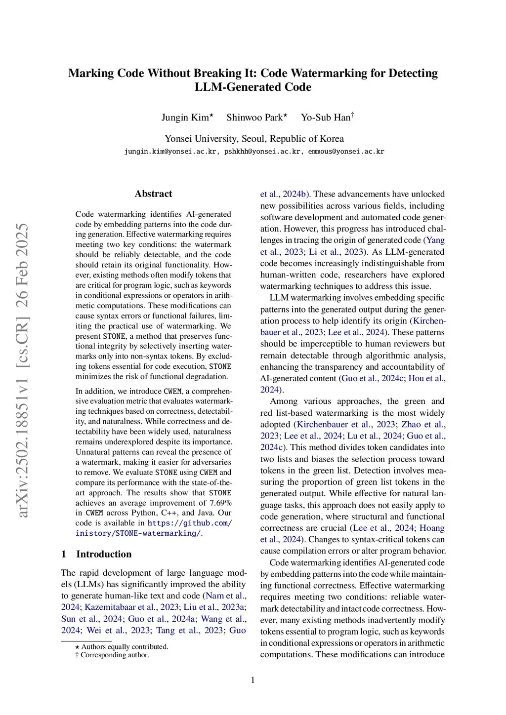 Identifying LLM-generated code through watermarking poses a challenge in preserving functional correctness. Previous methods rely on the assumption that watermarking high-entropy tokens effectively maintains output quality. Our analysis reveals a fundamental limitation of this assumption: syntax-critical tokens such as keywords often exhibit the highest entropy, making existing approaches vulnerable to logic corruption. We present STONE, a syntax-aware watermarking method that embeds watermarks only in non-syntactic tokens and preserves code integrity. For rigorous evaluation, we also introduce STEM, a comprehensive metric that balances three critical dimensions: correctness, detectability, and imperceptibility. Across Python, C++, and Java, STONE preserves correctness, sustains strong detectability, and achieves balanced performance with minimal computational overhead. Our implementation is available atthis https URL.