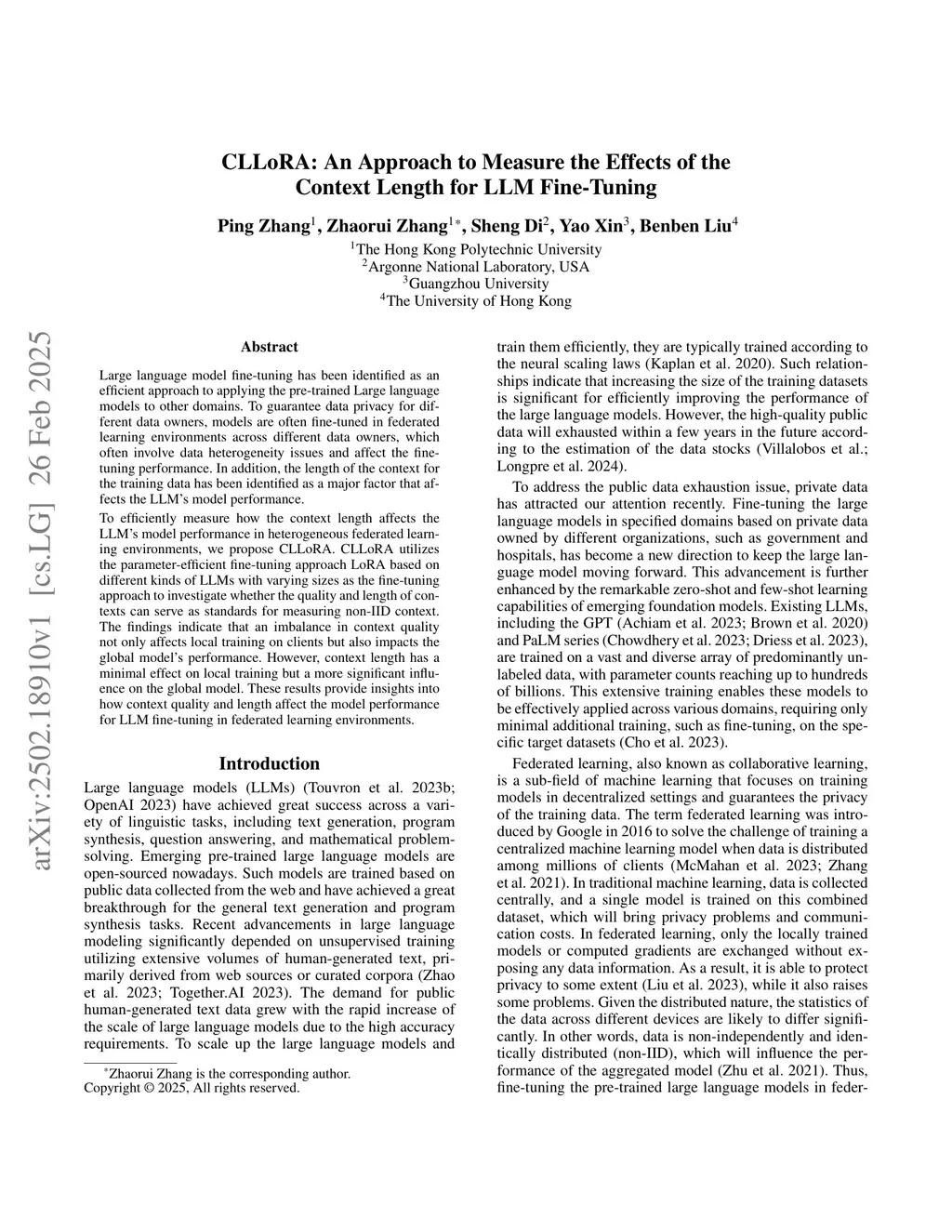 Large language model fine-tuning has been identified as an efficient approach to applying the pre-trained Large language models to other domains. To guarantee data privacy for different data owners, models are often fine-tuned in federated learning environments across different data owners, which often involve data heterogeneity issues and affect the fine-tuning performance. In addition, the length of the context for the training data has been identified as a major factor that affects the LLM's model performance.To efficiently measure how the context length affects the LLM's model performance in heterogeneous federated learning environments, we propose CLLoRA. CLLoRA utilizes the parameter-efficient fine-tuning approach LoRA based on different kinds of LLMs with varying sizes as the fine-tuning approach to investigate whether the quality and length of contexts can serve as standards for measuring non-IID context. The findings indicate that an imbalance in context quality not only affects local training on clients but also impacts the global model's performance. However, context length has a minimal effect on local training but a more significant influence on the global model. These results provide insights into how context quality and length affect the model performance for LLM fine-tuning in federated learning environments.