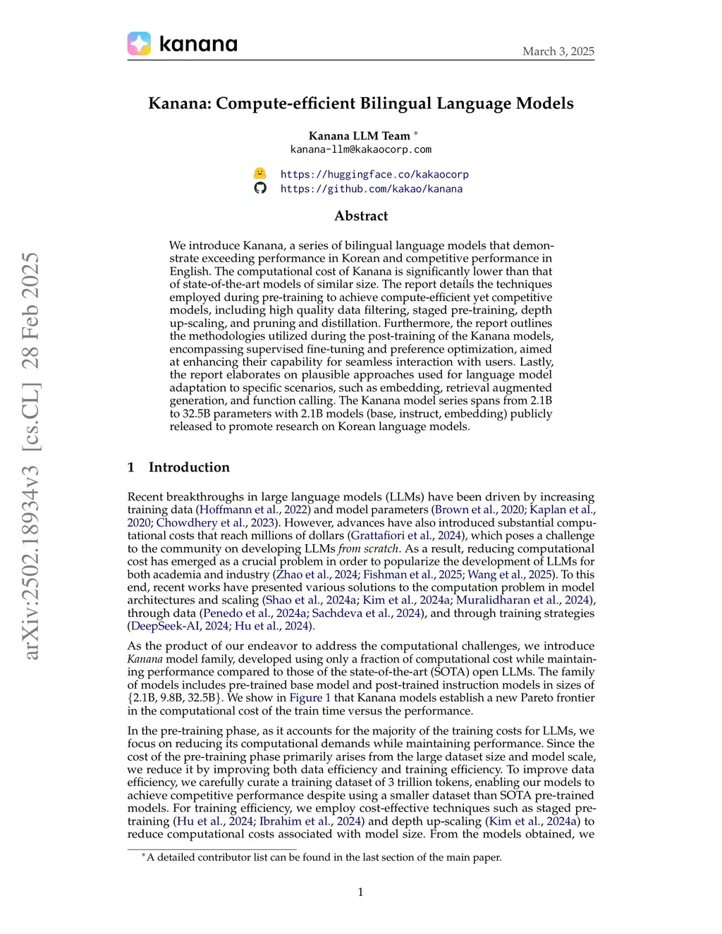 We introduce Kanana, a series of bilingual language models that demonstrate exceeding performance in Korean and competitive performance in English. The computational cost of Kanana is significantly lower than that of state-of-the-art models of similar size. The report details the techniques employed during pre-training to achieve compute-efficient yet competitive models, including high quality data filtering, staged pre-training, depth up-scaling, and pruning and distillation. Furthermore, the report outlines the methodologies utilized during the post-training of the Kanana models, encompassing supervised fine-tuning and preference optimization, aimed at enhancing their capability for seamless interaction with users. Lastly, the report elaborates on plausible approaches used for language model adaptation to specific scenarios, such as embedding, retrieval augmented generation, and function calling. The Kanana model series spans from 2.1B to 32.5B parameters with 2.1B models (base, instruct, embedding) publicly released to promote research on Korean language models.