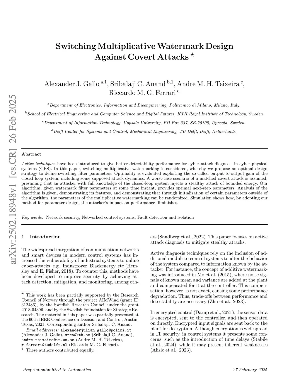 Switching multiplicative watermark design against covert attacks
