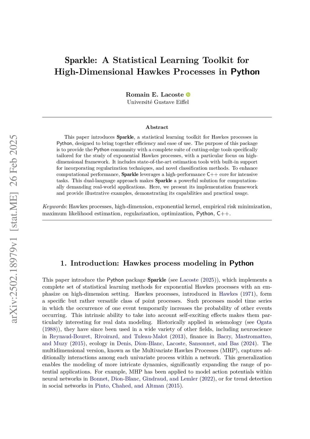 This paper introduces Sparklen, a statistical learning toolkit for Hawkes processes in Python, designed to bring together efficiency and ease of use. The purpose of this package is to provide the Python community with a complete suite of cutting-edge tools specifically tailored for the study of exponential Hawkes processes, with a particular focus on highdimensional framework. It includes state-of-the-art estimation tools with built-in support for incorporating regularization techniques, and novel classification methods. To enhance computational performance, Sparklen leverages a high-performance C++ core for intensive tasks. This dual-language approach makes Sparklen a powerful solution for computationally demanding real-world applications. Here, we present its implementation framework and provide illustrative examples, demonstrating its capabilities and practical usage.