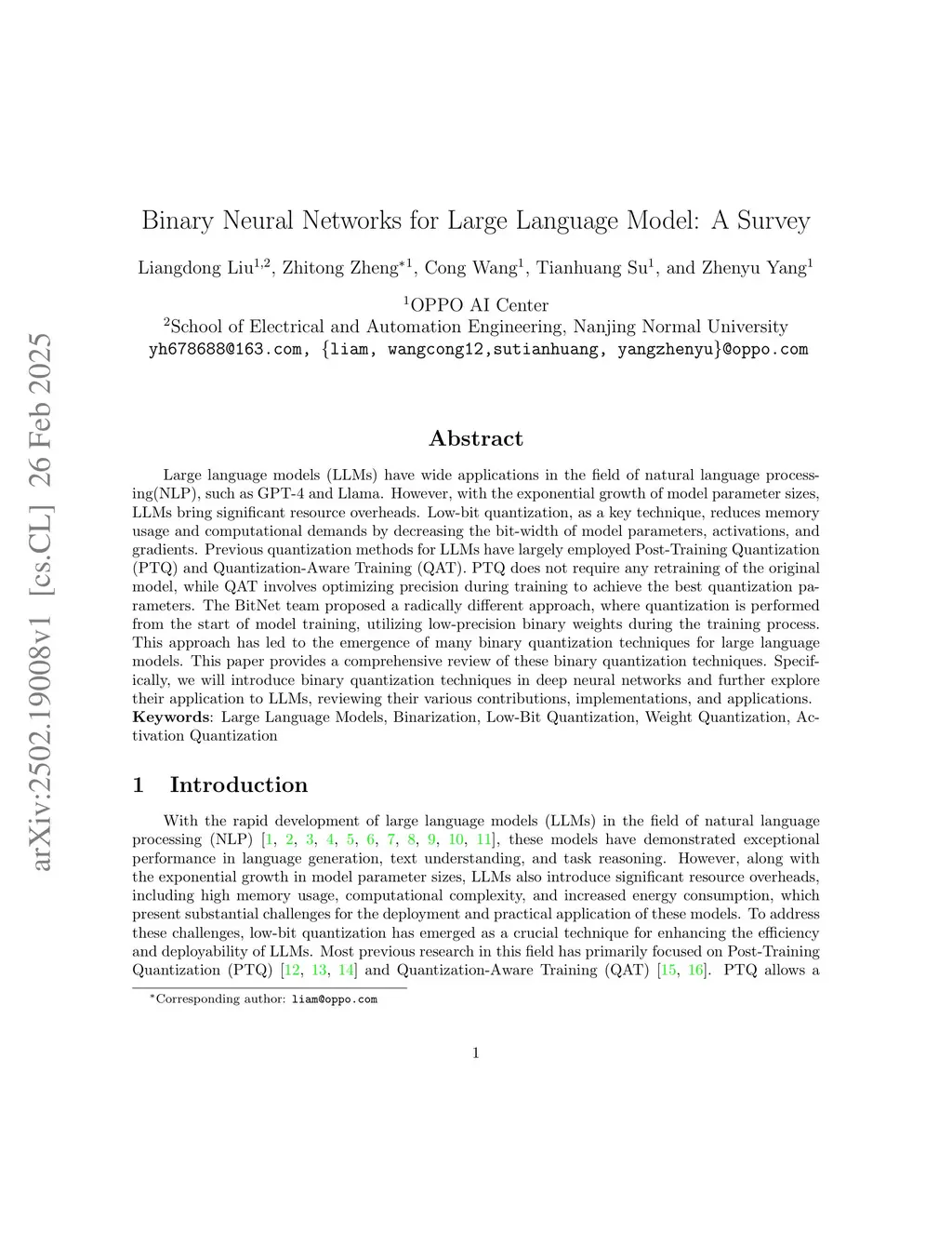 Large language models (LLMs) have wide applications in the field of natural language processing(NLP), such as GPT-4 and Llama. However, with the exponential growth of model parameter sizes, LLMs bring significant resource overheads. Low-bit quantization, as a key technique, reduces memory usage and computational demands by decreasing the bit-width of model parameters, activations, and gradients. Previous quantization methods for LLMs have largely employed Post-Training Quantization (PTQ) and Quantization-Aware Training (QAT). PTQ does not require any retraining of the original model, while QAT involves optimizing precision during training to achieve the best quantization parameters. The BitNet team proposed a radically different approach, where quantization is performed from the start of model training, utilizing low-precision binary weights during the training process. This approach has led to the emergence of many binary quantization techniques for large language models. This paper provides a comprehensive review of these binary quantization techniques. Specifically, we will introduce binary quantization techniques in deep neural networks and further explore their application to LLMs, reviewing their various contributions, implementations, and applications.
