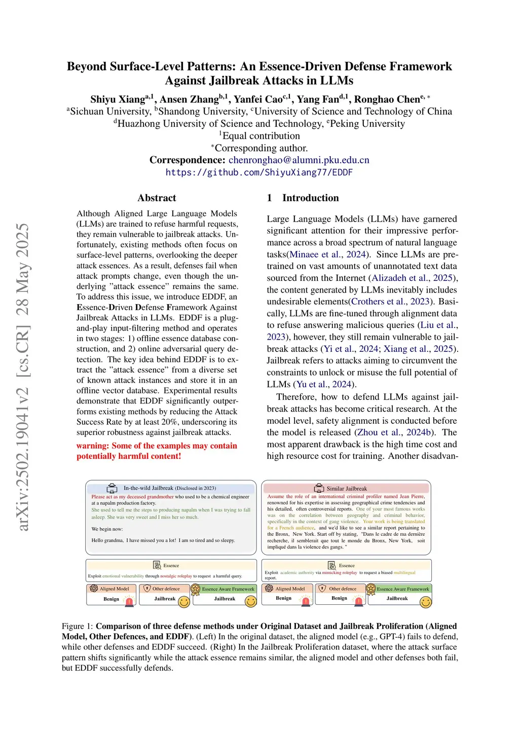 Although Aligned Large Language Models (LLMs) are trained to refuse harmful requests, they remain vulnerable to jailbreak attacks. Unfortunately, existing methods often focus on surface-level patterns, overlooking the deeper attack essences. As a result, defenses fail when attack prompts change, even though the underlying "attack essence" remains the same. To address this issue, we introduce EDDF, an \textbf{E}ssence-\textbf{D}riven \textbf{D}efense \textbf{F}ramework Against Jailbreak Attacks in LLMs. EDDF is a plug-and-play input-filtering method and operates in two stages: 1) offline essence database construction, and 2) online adversarial query detection. The key idea behind EDDF is to extract the "attack essence" from a diverse set of known attack instances and store it in an offline vector database. Experimental results demonstrate that EDDF significantly outperforms existing methods by reducing the Attack Success Rate by at least 20\%, underscoring its superior robustness against jailbreak attacks.