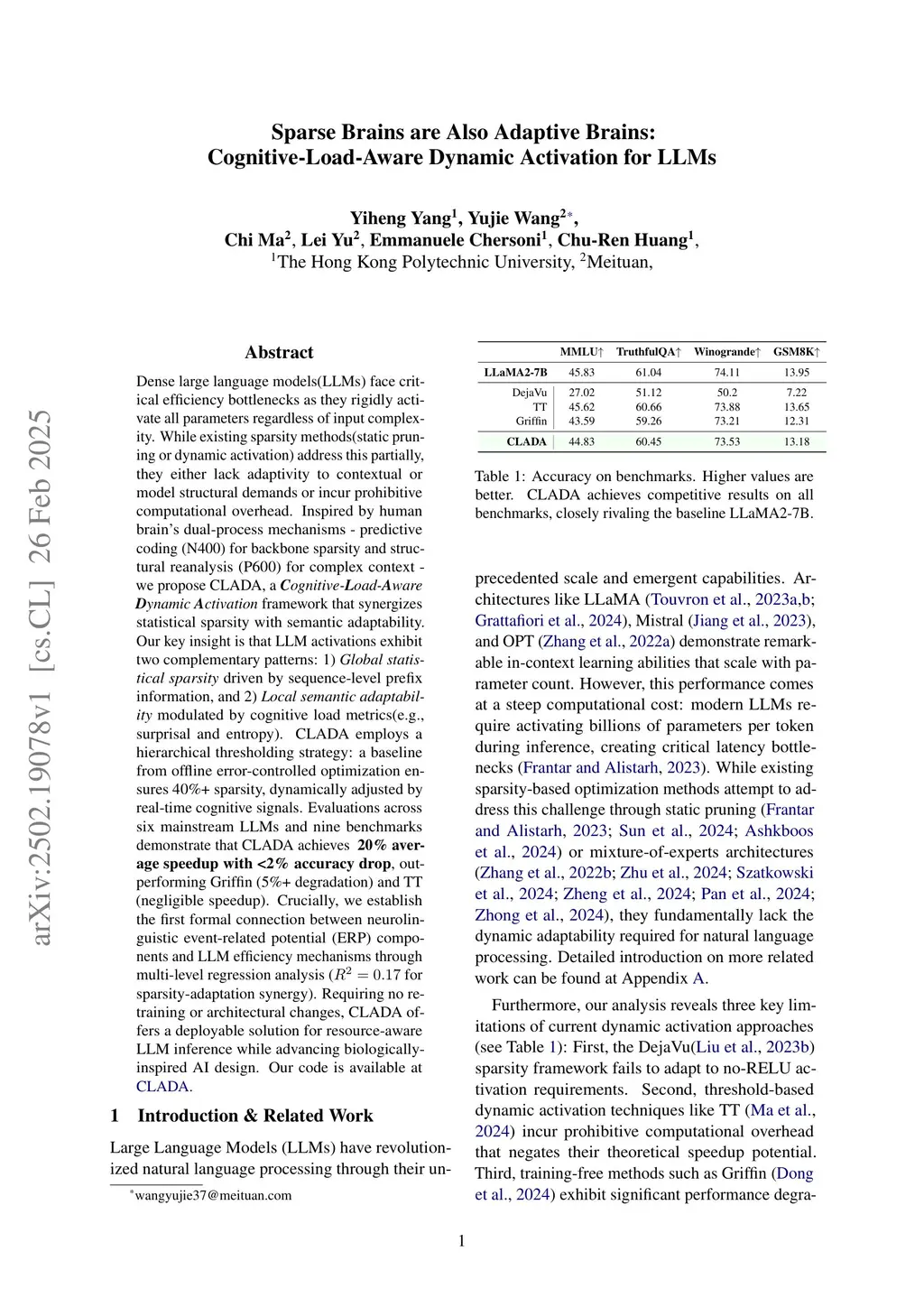 Dense large language models(LLMs) face critical efficiency bottlenecks as they rigidly activate all parameters regardless of input complexity. While existing sparsity methods(static pruning or dynamic activation) address this partially, they either lack adaptivity to contextual or model structural demands or incur prohibitive computational overhead. Inspired by human brain's dual-process mechanisms - predictive coding (N400) for backbone sparsity and structural reanalysis (P600) for complex context - we propose CLADA, a \textit{\textbf{C}ognitive-\textbf{L}oad-\textbf{A}ware \textbf{D}ynamic \textbf{A}ctivation} framework that synergizes statistical sparsity with semantic adaptability. Our key insight is that LLM activations exhibit two complementary patterns: 1) \textit{Global statistical sparsity} driven by sequence-level prefix information, and 2) \textit{Local semantic adaptability} modulated by cognitive load metrics(e.g., surprisal and entropy). CLADA employs a hierarchical thresholding strategy: a baseline from offline error-controlled optimization ensures 40\%+ sparsity, dynamically adjusted by real-time cognitive signals. Evaluations across six mainstream LLMs and nine benchmarks demonstrate that CLADA achieves \textbf{~20\% average speedup with <2\% accuracy drop}, outperforming Griffin (5\%+ degradation) and TT (negligible speedup). Crucially, we establish the first formal connection between neurolinguistic event-related potential (ERP) components and LLM efficiency mechanisms through multi-level regression analysis ( for sparsity-adaptation synergy). Requiring no retraining or architectural changes, CLADA offers a deployable solution for resource-aware LLM inference while advancing biologically-inspired AI design. Our code is available at \href{this https URL}{CLADA}.