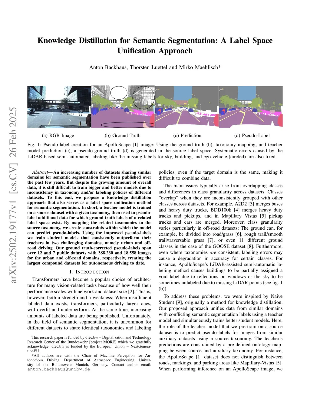 An increasing number of datasets sharing similar domains for semantic segmentation have been published over the past few years. But despite the growing amount of overall data, it is still difficult to train bigger and better models due to inconsistency in taxonomy and/or labeling policies of different datasets. To this end, we propose a knowledge distillation approach that also serves as a label space unification method for semantic segmentation. In short, a teacher model is trained on a source dataset with a given taxonomy, then used to pseudo-label additional data for which ground truth labels of a related label space exist. By mapping the related taxonomies to the source taxonomy, we create constraints within which the model can predict pseudo-labels. Using the improved pseudo-labels we train student models that consistently outperform their teachers in two challenging domains, namely urban and off-road driving. Our ground truth-corrected pseudo-labels span over 12 and 7 public datasets with 388.230 and 18.558 images for the urban and off-road domains, respectively, creating the largest compound datasets for autonomous driving to date.