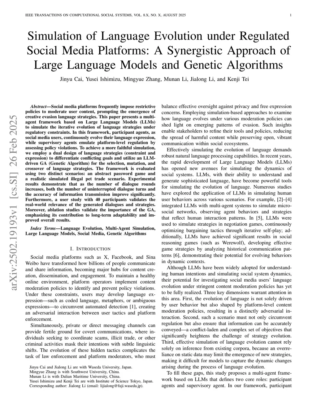 Social media platforms frequently impose restrictive policies to moderate user content, prompting the emergence of creative evasion language strategies. This paper presents a multi-agent framework based on Large Language Models (LLMs) to simulate the iterative evolution of language strategies under regulatory constraints. In this framework, participant agents, as social media users, continuously evolve their language expression, while supervisory agents emulate platform-level regulation by assessing policy violations. To achieve a more faithful simulation, we employ a dual design of language strategies (constraint and expression) to differentiate conflicting goals and utilize an LLM-driven GA (Genetic Algorithm) for the selection, mutation, and crossover of language strategies. The framework is evaluated using two distinct scenarios: an abstract password game and a realistic simulated illegal pet trade scenario. Experimental results demonstrate that as the number of dialogue rounds increases, both the number of uninterrupted dialogue turns and the accuracy of information transmission improve significantly. Furthermore, a user study with 40 participants validates the real-world relevance of the generated dialogues and strategies. Moreover, ablation studies validate the importance of the GA, emphasizing its contribution to long-term adaptability and improved overall results.