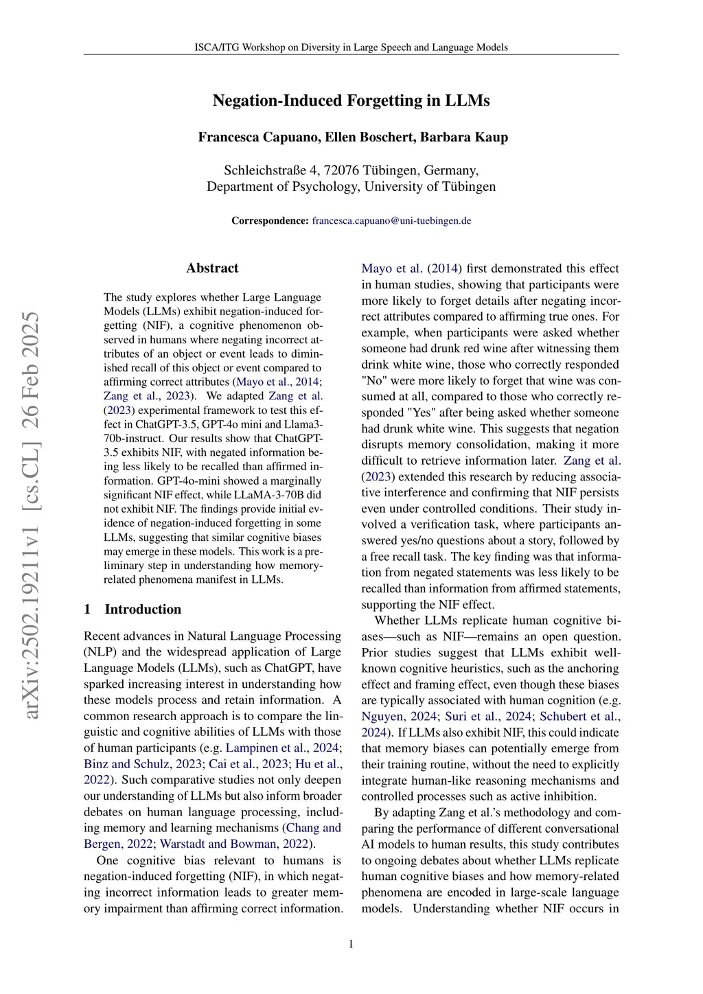 The study explores whether Large Language Models (LLMs) exhibit negation-induced forgetting (NIF), a cognitive phenomenon observed in humans where negating incorrect attributes of an object or event leads to diminished recall of this object or event compared to affirming correct attributes (Mayo et al., 2014; Zang et al., 2023). We adapted Zang et al. (2023) experimental framework to test this effect in ChatGPT-3.5, GPT-4o mini and Llama3-70b-instruct. Our results show that ChatGPT-3.5 exhibits NIF, with negated information being less likely to be recalled than affirmed information. GPT-4o-mini showed a marginally significant NIF effect, while LLaMA-3-70B did not exhibit NIF. The findings provide initial evidence of negation-induced forgetting in some LLMs, suggesting that similar cognitive biases may emerge in these models. This work is a preliminary step in understanding how memory-related phenomena manifest in LLMs.