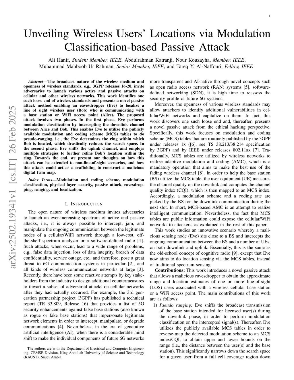 The broadcast nature of the wireless medium and openness of wireless standards, e.g., 3GPP releases 16-20, invite adversaries to launch various active and passive attacks on cellular and other wireless networks. This work identifies one such loose end of wireless standards and presents a novel passive attack method enabling an eavesdropper (Eve) to localize a line of sight wireless user (Bob) who is communicating with a base station or WiFi access point (Alice). The proposed attack involves two phases. In the first phase, Eve performs modulation classification by intercepting the downlink channel between Alice and Bob. This enables Eve to utilize the publicly available modulation and coding scheme (MCS) tables to do pesudo-ranging, i.e., the Eve determines the ring within which Bob is located, which drastically reduces the search space. In the second phase, Eve sniffs the uplink channel, and employs multiple strategies to further refine Bob's location within the ring. Towards the end, we present our thoughts on how this attack can be extended to non-line-of-sight scenarios, and how this attack could act as a scaffolding to construct a malicious digital twin map.