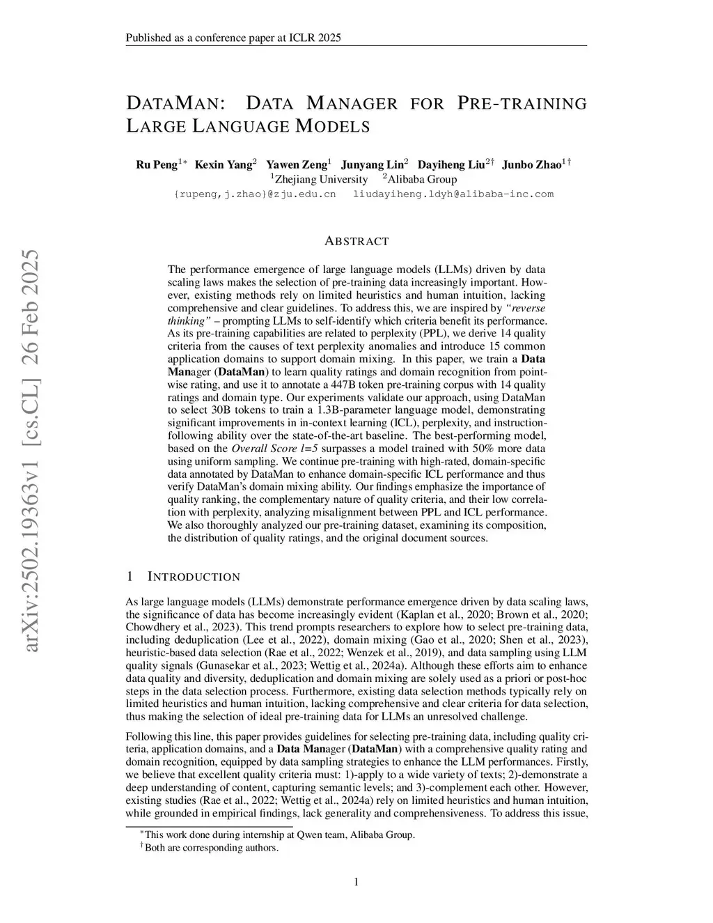 DataMan: Data Manager for Pre-training Large Language Models