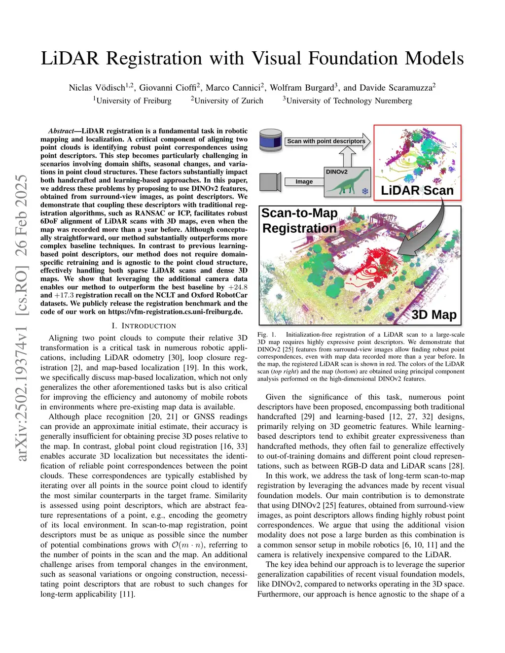 LiDAR registration is a fundamental task in robotic mapping and localization. A critical component of aligning two point clouds is identifying robust point correspondences using point descriptors. This step becomes particularly challenging in scenarios involving domain shifts, seasonal changes, and variations in point cloud structures. These factors substantially impact both handcrafted and learning-based approaches. In this paper, we address these problems by proposing to use DINOv2 features, obtained from surround-view images, as point descriptors. We demonstrate that coupling these descriptors with traditional registration algorithms, such as RANSAC or ICP, facilitates robust 6DoF alignment of LiDAR scans with 3D maps, even when the map was recorded more than a year before. Although conceptually straightforward, our method substantially outperforms more complex baseline techniques. In contrast to previous learning-based point descriptors, our method does not require domain-specific retraining and is agnostic to the point cloud structure, effectively handling both sparse LiDAR scans and dense 3D maps. We show that leveraging the additional camera data enables our method to outperform the best baseline by +24.8 and +17.3 registration recall on the NCLT and Oxford RobotCar datasets. We publicly release the registration benchmark and the code of our work onthis https URL.