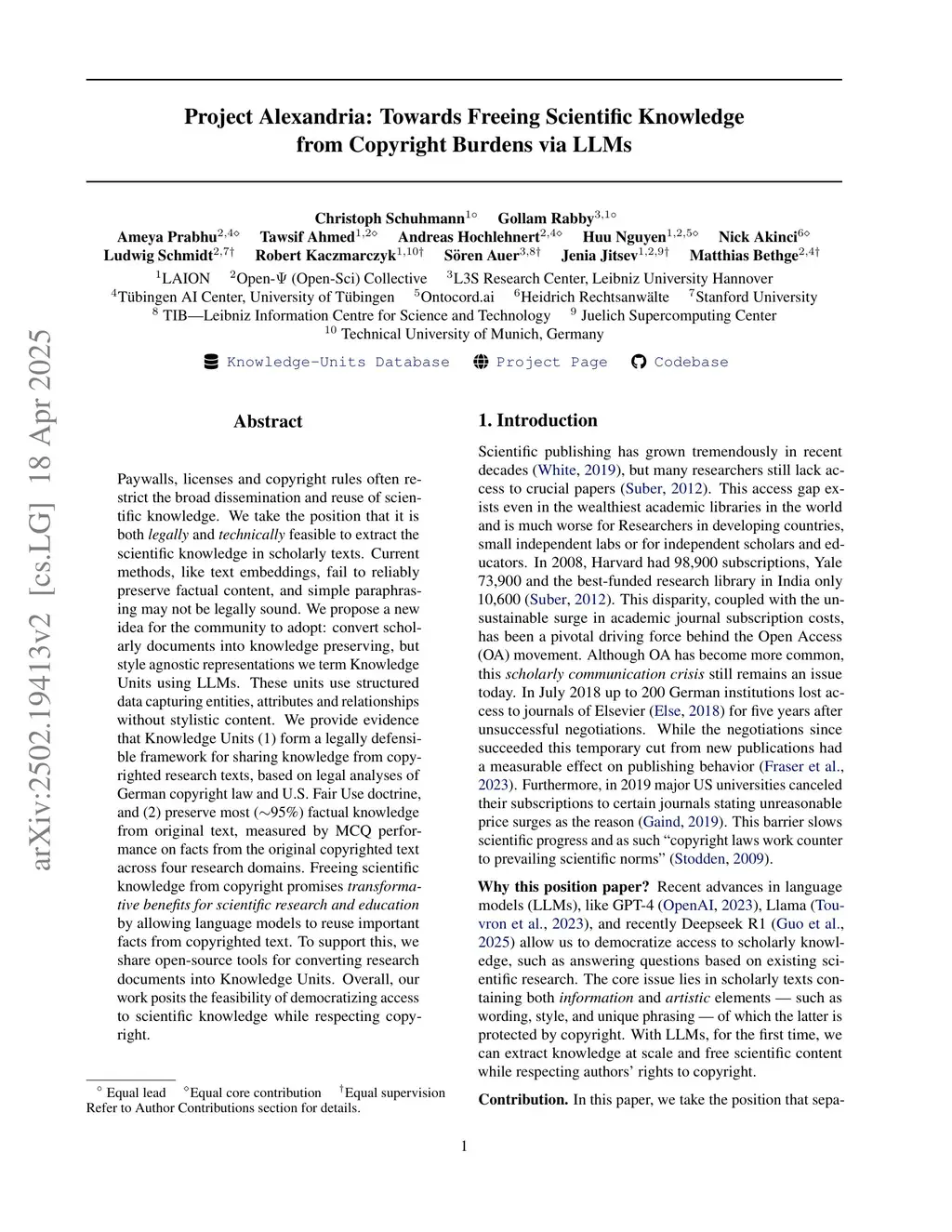 Paywalls, licenses and copyright rules often restrict the broad dissemination and reuse of scientific knowledge. We take the position that it is both legally and technically feasible to extract the scientific knowledge in scholarly texts. Current methods, like text embeddings, fail to reliably preserve factual content, and simple paraphrasing may not be legally sound. We propose a new idea for the community to adopt: convert scholarly documents into knowledge preserving, but style agnostic representations we term Knowledge Units using LLMs. These units use structured data capturing entities, attributes and relationships without stylistic content. We provide evidence that Knowledge Units (1) form a legally defensible framework for sharing knowledge from copyrighted research texts, based on legal analyses of German copyright law and U.S. Fair Use doctrine, and (2) preserve most (~95\%) factual knowledge from original text, measured by MCQ performance on facts from the original copyrighted text across four research domains. Freeing scientific knowledge from copyright promises transformative benefits for scientific research and education by allowing language models to reuse important facts from copyrighted text. To support this, we share open-source tools for converting research documents into Knowledge Units. Overall, our work posits the feasibility of democratizing access to scientific knowledge while respecting copyright.
