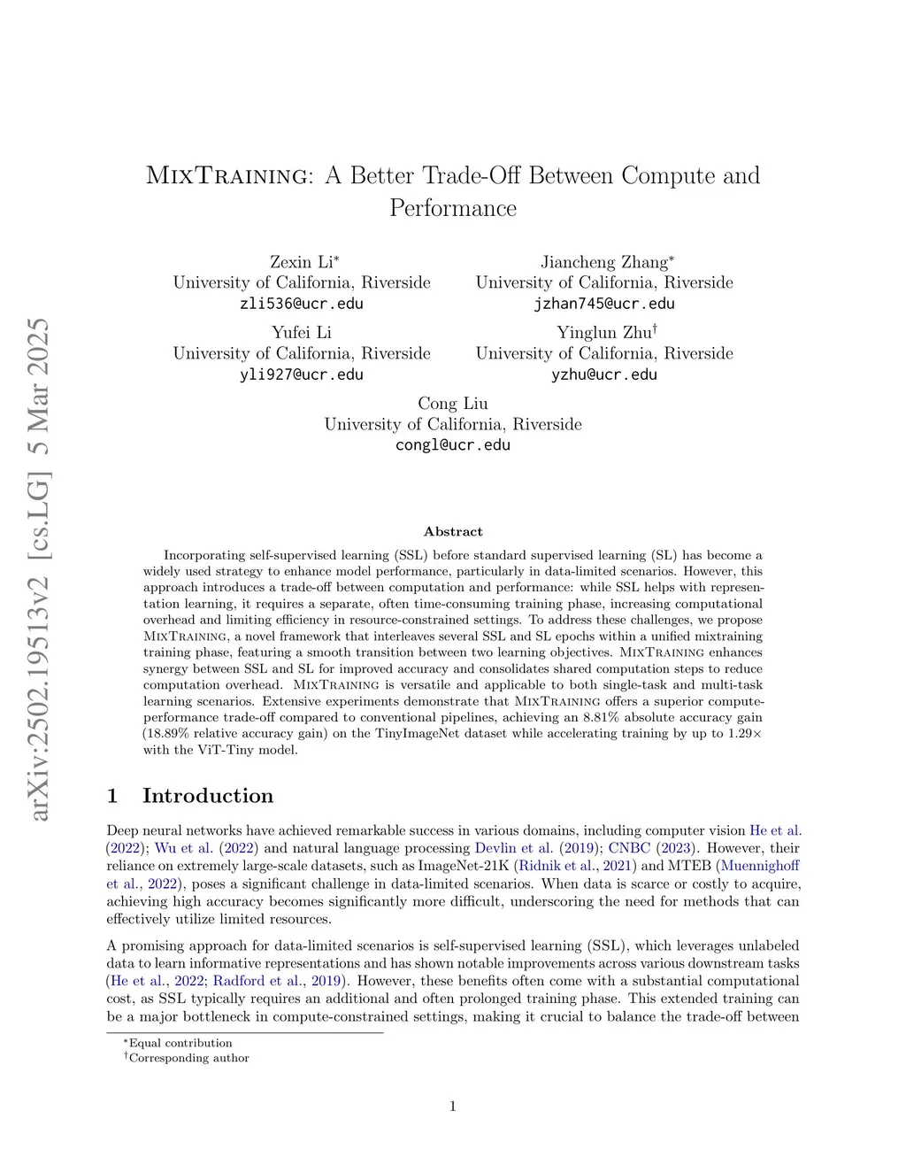 Incorporating self-supervised learning (SSL) before standard supervised learning (SL) has become a widely used strategy to enhance model performance, particularly in data-limited scenarios. However, this approach introduces a trade-off between computation and performance: while SSL helps with representation learning, it requires a separate, often time-consuming training phase, increasing computational overhead and limiting efficiency in resource-constrained settings. To address these challenges, we propose MixTraining, a novel framework that interleaves several SSL and SL epochs within a unified mixtraining training phase, featuring a smooth transition between two learning objectives. MixTraining enhances synergy between SSL and SL for improved accuracy and consolidates shared computation steps to reduce computation overhead. MixTraining is versatile and applicable to both single-task and multi-task learning scenarios. Extensive experiments demonstrate that MixTraining offers a superior compute-performance trade-off compared to conventional pipelines, achieving an 8.81% absolute accuracy gain (18.89% relative accuracy gain) on the TinyImageNet dataset while accelerating training by up to 1.29xwith the ViT-Tiny model.