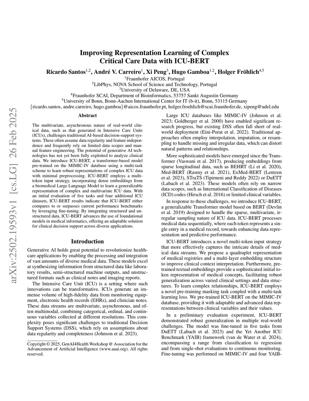 The multivariate, asynchronous nature of real-world clinical data, such as that generated in Intensive Care Units (ICUs), challenges traditional AI-based decision-support systems. These often assume data regularity and feature independence and frequently rely on limited data scopes and manual feature engineering. The potential of generative AI technologies has not yet been fully exploited to analyze clinical data. We introduce ICU-BERT, a transformer-based model pre-trained on the MIMIC-IV database using a multi-task scheme to learn robust representations of complex ICU data with minimal preprocessing. ICU-BERT employs a multi-token input strategy, incorporating dense embeddings from a biomedical Large Language Model to learn a generalizable representation of complex and multivariate ICU data. With an initial evaluation of five tasks and four additional ICU datasets, ICU-BERT results indicate that ICU-BERT either compares to or surpasses current performance benchmarks by leveraging fine-tuning. By integrating structured and unstructured data, ICU-BERT advances the use of foundational models in medical informatics, offering an adaptable solution for clinical decision support across diverse applications.