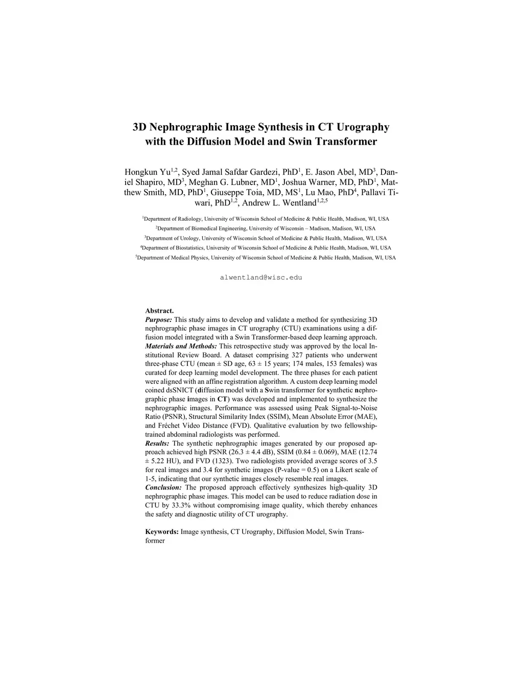 3D Nephrographic Image Synthesis in CT Urography with the Diffusion Model and Swin Transformer
