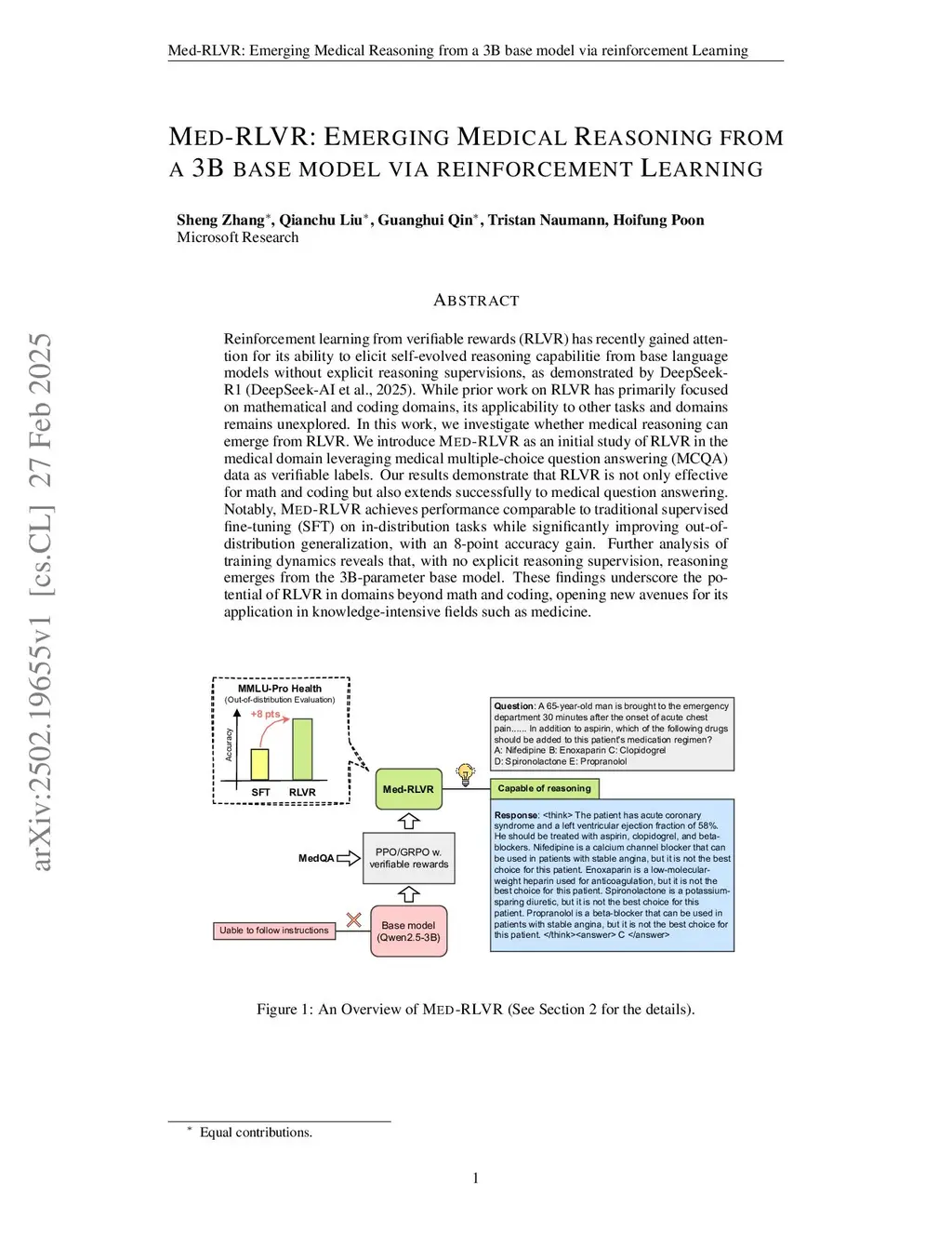 Reinforcement learning from verifiable rewards (RLVR) has recently gained attention for its ability to elicit self-evolved reasoning capabilitie from base language models without explicit reasoning supervisions, as demonstrated by DeepSeek-R1. While prior work on RLVR has primarily focused on mathematical and coding domains, its applicability to other tasks and domains remains unexplored. In this work, we investigate whether medical reasoning can emerge from RLVR. We introduce Med-RLVR as an initial study of RLVR in the medical domain leveraging medical multiple-choice question answering (MCQA) data as verifiable labels. Our results demonstrate that RLVR is not only effective for math and coding but also extends successfully to medical question answering. Notably, Med-RLVR achieves performance comparable to traditional supervised fine-tuning (SFT) on in-distribution tasks while significantly improving out-of-distribution generalization, with an 8-point accuracy gain. Further analysis of training dynamics reveals that, with no explicit reasoning supervision, reasoning emerges from the 3B-parameter base model. These findings underscore the potential of RLVR in domains beyond math and coding, opening new avenues for its application in knowledge-intensive fields such as medicine.