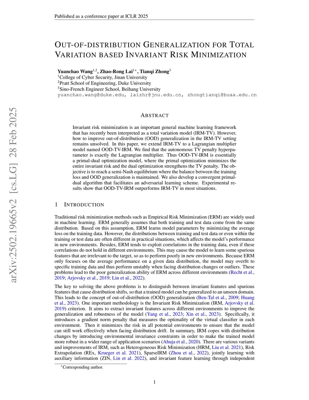 Invariant risk minimization is an important general machine learning framework that has recently been interpreted as a total variation model (IRM-TV). However, how to improve out-of-distribution (OOD) generalization in the IRM-TV setting remains unsolved. In this paper, we extend IRM-TV to a Lagrangian multiplier model named OOD-TV-IRM. We find that the autonomous TV penalty hyperparameter is exactly the Lagrangian multiplier. Thus OOD-TV-IRM is essentially a primal-dual optimization model, where the primal optimization minimizes the entire invariant risk and the dual optimization strengthens the TV penalty. The objective is to reach a semi-Nash equilibrium where the balance between the training loss and OOD generalization is maintained. We also develop a convergent primal-dual algorithm that facilitates an adversarial learning scheme. Experimental results show that OOD-TV-IRM outperforms IRM-TV in most situations.