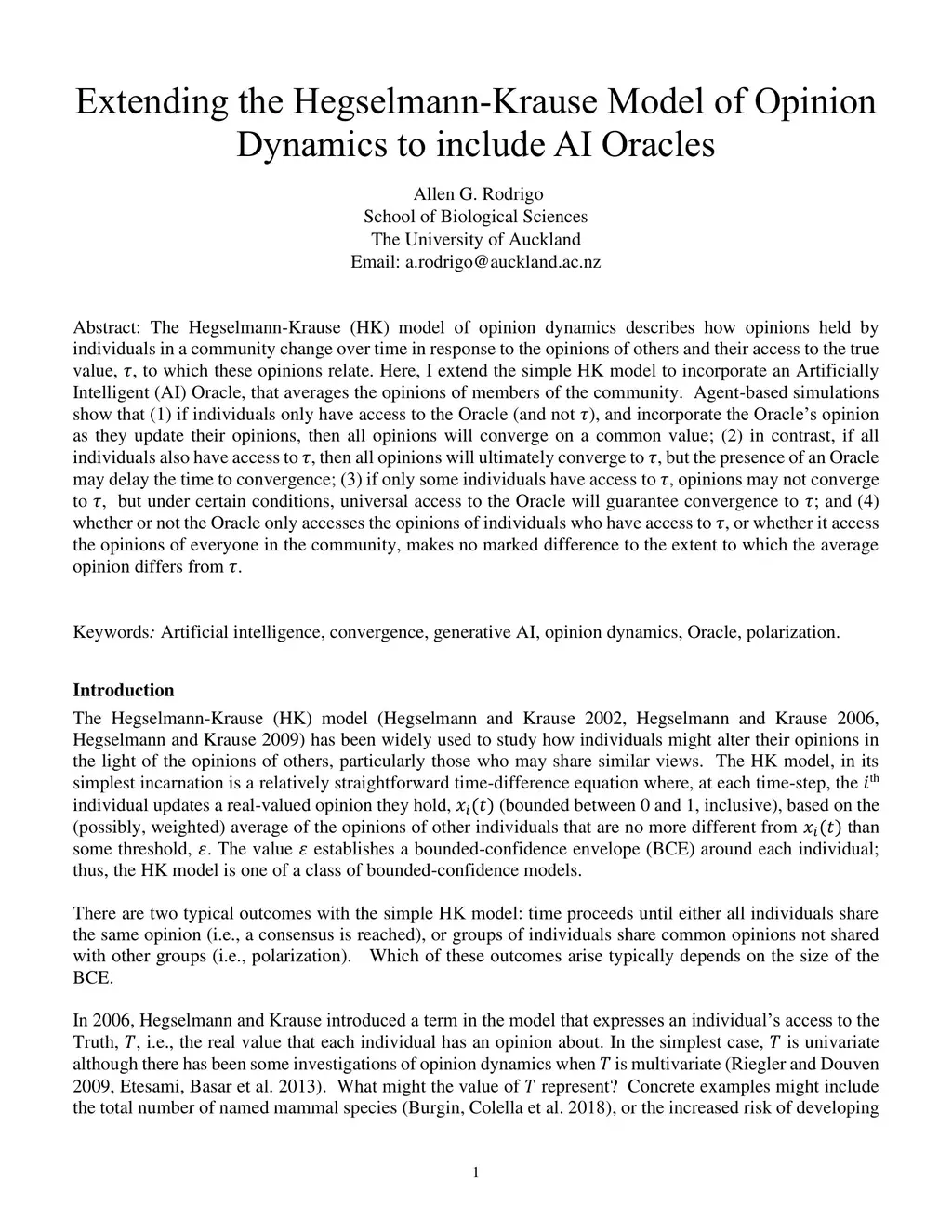 The Hegselmann-Krause (HK) model of opinion dynamics describes how opinions held by individuals in a community change over time in response to the opinions of others and their access to the true value, T, to which these opinions relate. Here, I extend the simple HK model to incorporate an Artificially Intelligent (AI) Oracle that averages the opinions of members of the community. Agent-based simulations show that (1) if individuals only have access to the Oracle (and not T), and incorporate the Oracle's opinion as they update their opinions, then all opinions will converge on a common value; (2) in contrast, if all individuals also have access to T, then all opinions will ultimately converge to T, but the presence of an Oracle may delay the time to convergence; (3) if only some individuals have access to T, opinions may not converge to T, but under certain conditions, universal access to the Oracle will guarantee convergence to T; and (4) whether or not the Oracle only accesses the opinions of individuals who have access to T, or whether it accesses the opinions of everyone in the community, makes no marked difference to the extent to which the average opinion differs from T.