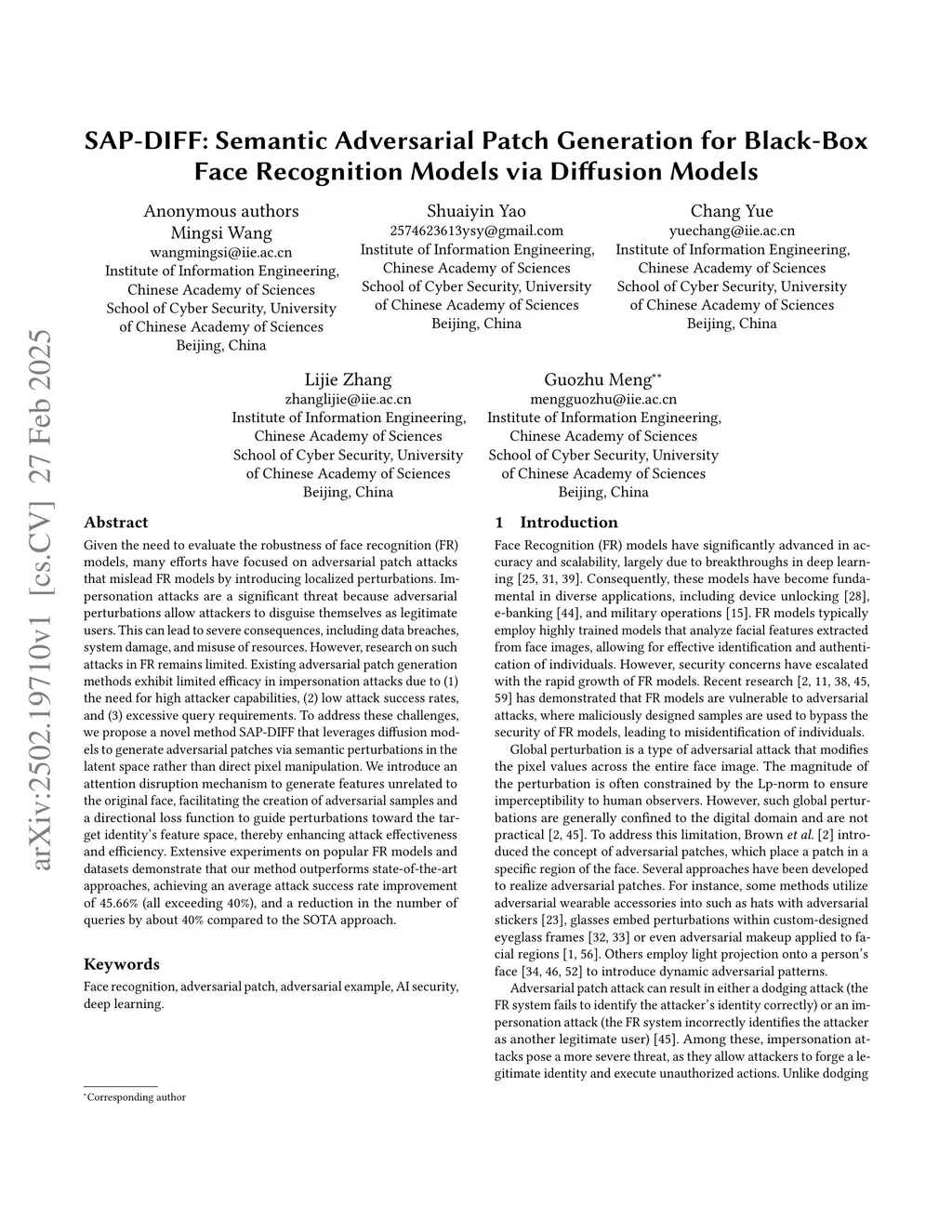 SAP-DIFF: Semantic Adversarial Patch Generation for Black-Box Face Recognition Models via Diffusion Models