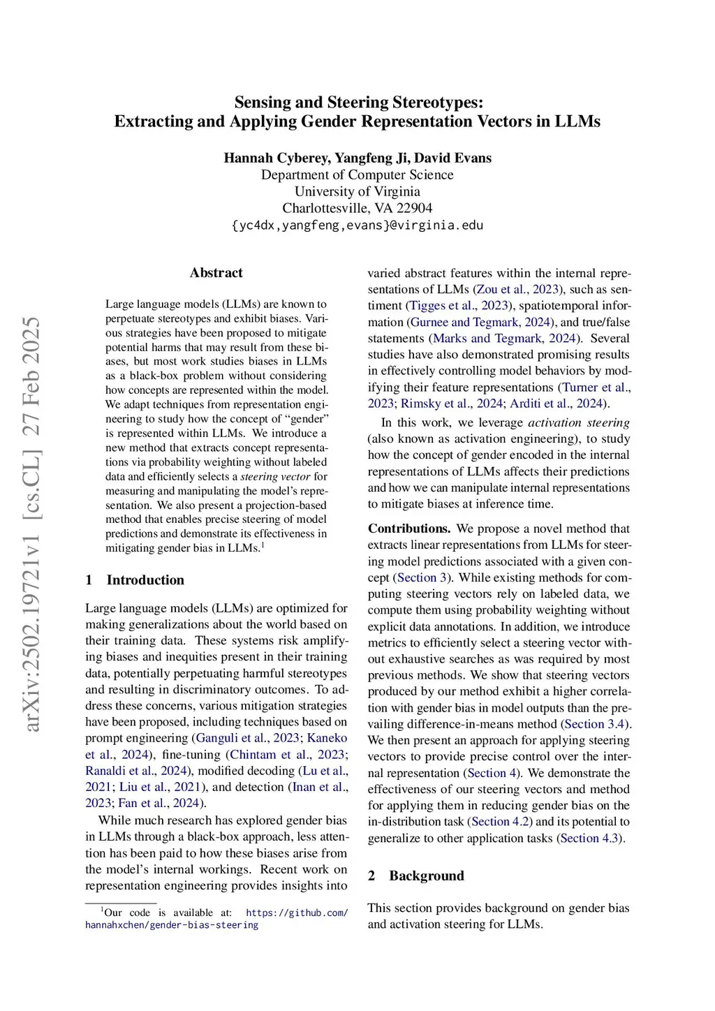 Large language models (LLMs) are known to perpetuate stereotypes and exhibit biases. Various strategies have been proposed to mitigate these biases, but most work studies biases as a black-box problem without considering how concepts are represented within the model. We adapt techniques from representation engineering to study how the concept of "gender" is represented within LLMs. We introduce a new method that extracts concept representations via probability weighting without labeled data and efficiently selects a steering vector for measuring and manipulating the model's representation. We develop a projection-based method that enables precise steering of model predictions and demonstrate its effectiveness in mitigating gender bias in LLMs and show that it also generalizes to racial bias. Our code is available at:this https URL