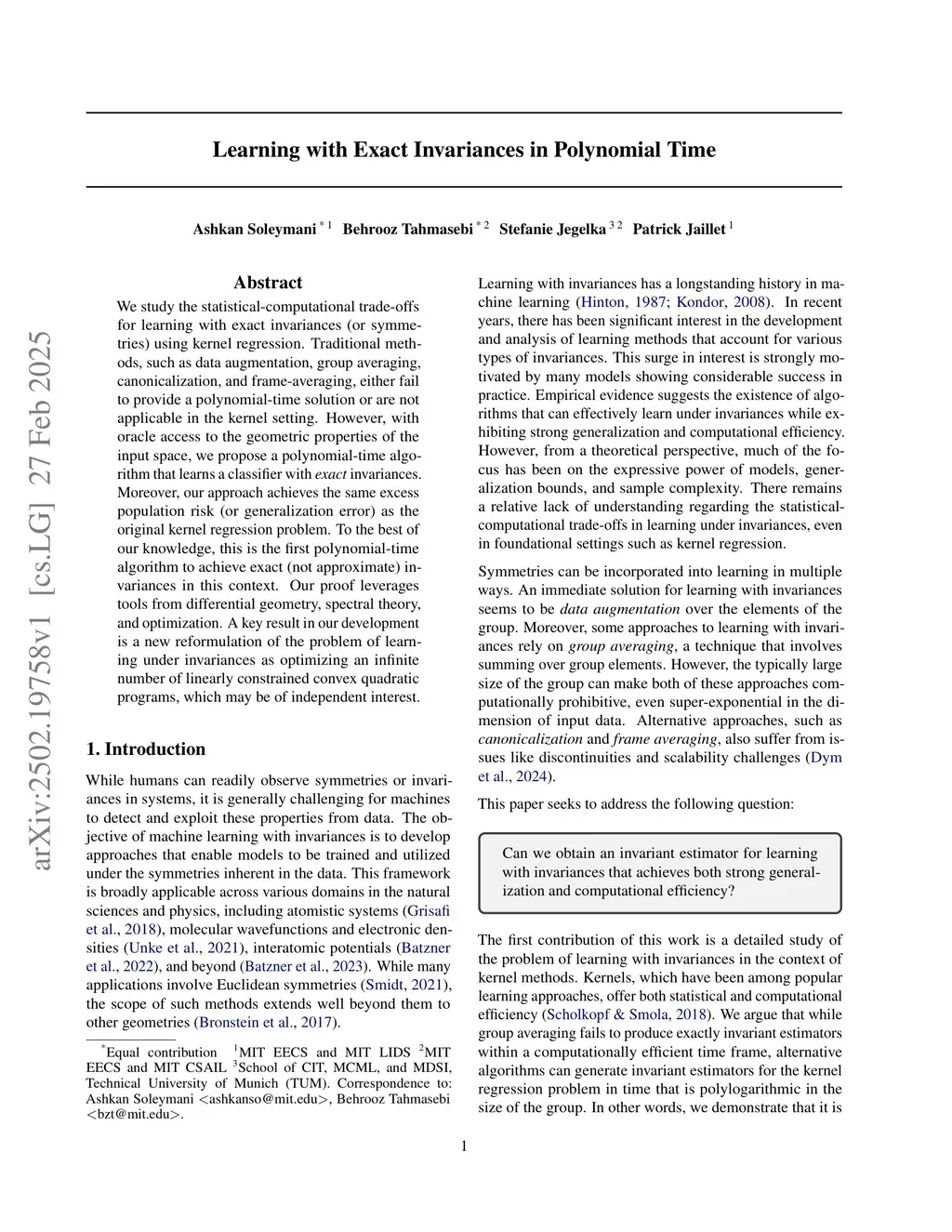We study the statistical-computational trade-offs for learning with exact invariances (or symmetries) using kernel regression. Traditional methods, such as data augmentation, group averaging, canonicalization, and frame-averaging, either fail to provide a polynomial-time solution or are not applicable in the kernel setting. However, with oracle access to the geometric properties of the input space, we propose a polynomial-time algorithm that learns a classifier with \emph{exact} invariances. Moreover, our approach achieves the same excess population risk (or generalization error) as the original kernel regression problem. To the best of our knowledge, this is the first polynomial-time algorithm to achieve exact (not approximate) invariances in this context. Our proof leverages tools from differential geometry, spectral theory, and optimization. A key result in our development is a new reformulation of the problem of learning under invariances as optimizing an infinite number of linearly constrained convex quadratic programs, which may be of independent interest.