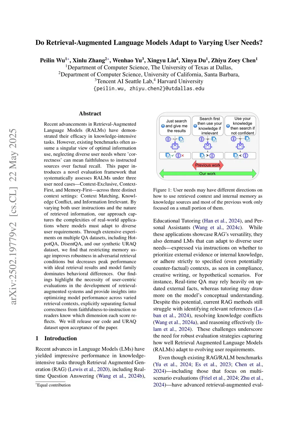 Recent advancements in Retrieval-Augmented Language Models (RALMs) have demonstrated their efficacy in knowledge-intensive tasks. However, existing evaluation benchmarks often assume a single optimal approach to leveraging retrieved information, failing to account for varying user needs. This paper introduces a novel evaluation framework that systematically assesses RALMs under three user need cases-Context-Exclusive, Context-First, and Memory-First-across three distinct context settings: Context Matching, Knowledge Conflict, and Information Irrelevant. By varying both user instructions and the nature of retrieved information, our approach captures the complexities of real-world applications where models must adapt to diverse user requirements. Through extensive experiments on multiple QA datasets, including HotpotQA, DisentQA, and our newly constructed synthetic URAQ dataset, we find that restricting memory usage improves robustness in adversarial retrieval conditions but decreases peak performance with ideal retrieval results and model family dominates behavioral differences. Our findings highlight the necessity of user-centric evaluations in the development of retrieval-augmented systems and provide insights into optimizing model performance across varied retrieval contexts. We will release our code and URAQ dataset upon acceptance of the paper.