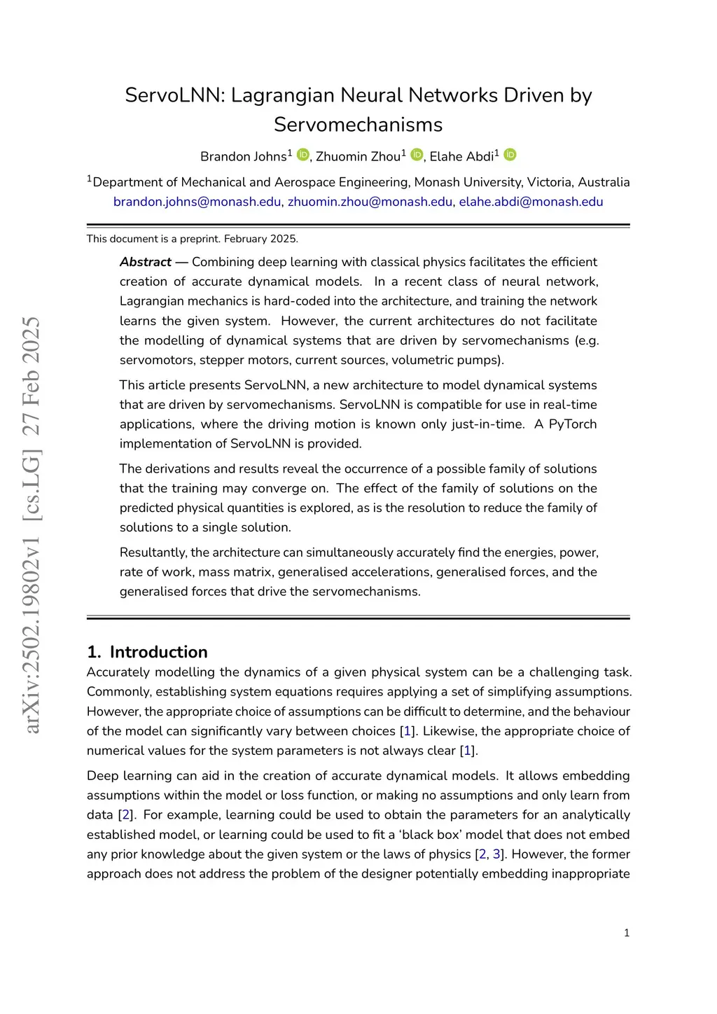 Combining deep learning with classical physics facilitates the efficient creation of accurate dynamical models. In a recent class of neural network, Lagrangian mechanics is hard-coded into the architecture, and training the network learns the given system. However, the current architectures do not facilitate the modelling of dynamical systems that are driven by servomechanisms (e.g. servomotors, stepper motors, current sources, volumetric pumps). This article presents ServoLNN, a new architecture to model dynamical systems that are driven by servomechanisms. ServoLNN is compatible for use in real-time applications, where the driving motion is known only just-in-time. A PyTorch implementation of ServoLNN is provided. The derivations and results reveal the occurrence of a possible family of solutions that the training may converge on. The effect of the family of solutions on the predicted physical quantities is explored, as is the resolution to reduce the family of solutions to a single solution. Resultantly, the architecture can simultaneously accurately find the energies, power, rate of work, mass matrix, generalised accelerations, generalised forces, and the generalised forces that drive the servomechanisms.