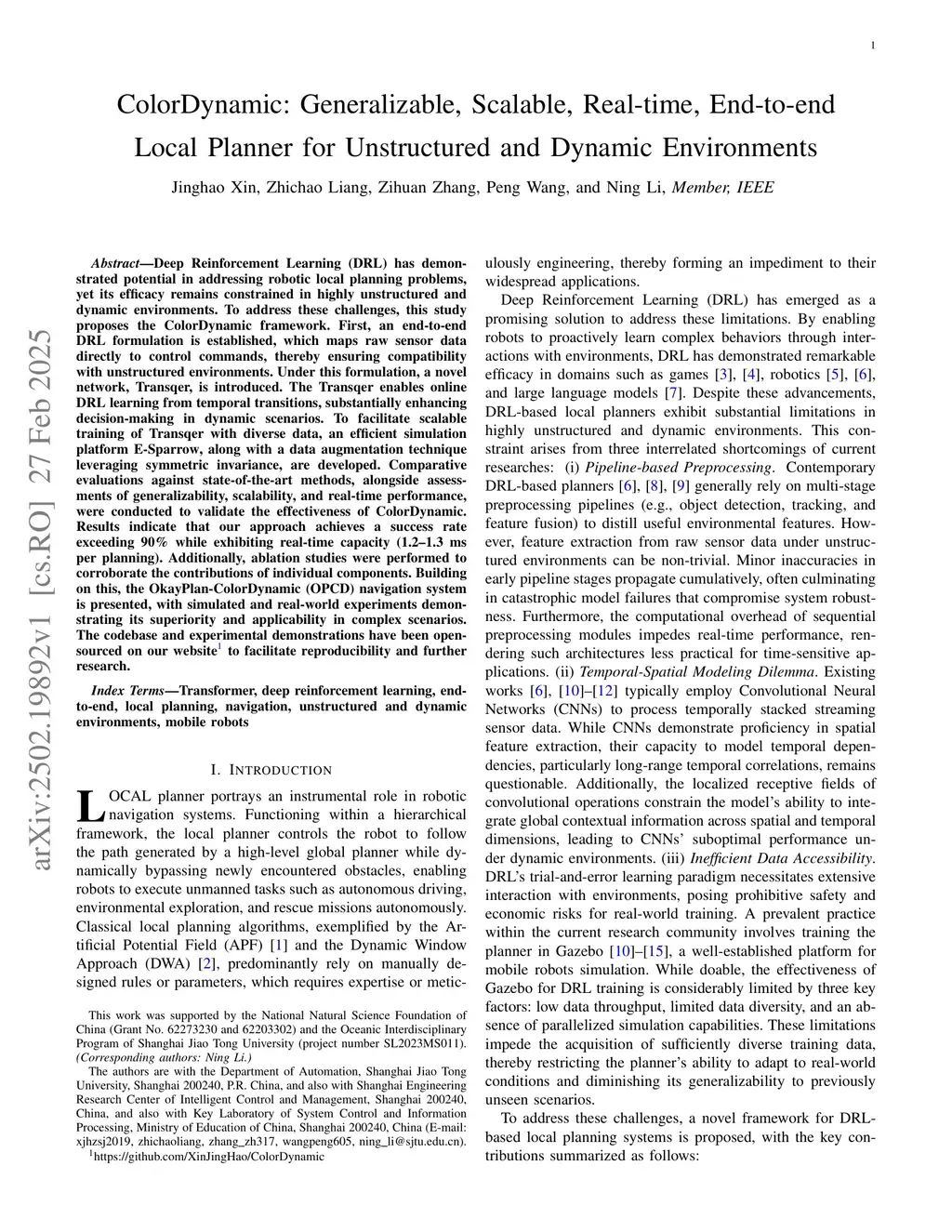 Deep Reinforcement Learning (DRL) has demonstrated potential in addressing robotic local planning problems, yet its efficacy remains constrained in highly unstructured and dynamic environments. To address these challenges, this study proposes the ColorDynamic framework. First, an end-to-end DRL formulation is established, which maps raw sensor data directly to control commands, thereby ensuring compatibility with unstructured environments. Under this formulation, a novel network, Transqer, is introduced. The Transqer enables online DRL learning from temporal transitions, substantially enhancing decision-making in dynamic scenarios. To facilitate scalable training of Transqer with diverse data, an efficient simulation platform E-Sparrow, along with a data augmentation technique leveraging symmetric invariance, are developed. Comparative evaluations against state-of-the-art methods, alongside assessments of generalizability, scalability, and real-time performance, were conducted to validate the effectiveness of ColorDynamic. Results indicate that our approach achieves a success rate exceeding 90% while exhibiting real-time capacity (1.2-1.3 ms per planning). Additionally, ablation studies were performed to corroborate the contributions of individual components. Building on this, the OkayPlan-ColorDynamic (OPCD) navigation system is presented, with simulated and real-world experiments demonstrating its superiority and applicability in complex scenarios. The codebase and experimental demonstrations have been open-sourced on our website to facilitate reproducibility and further research.