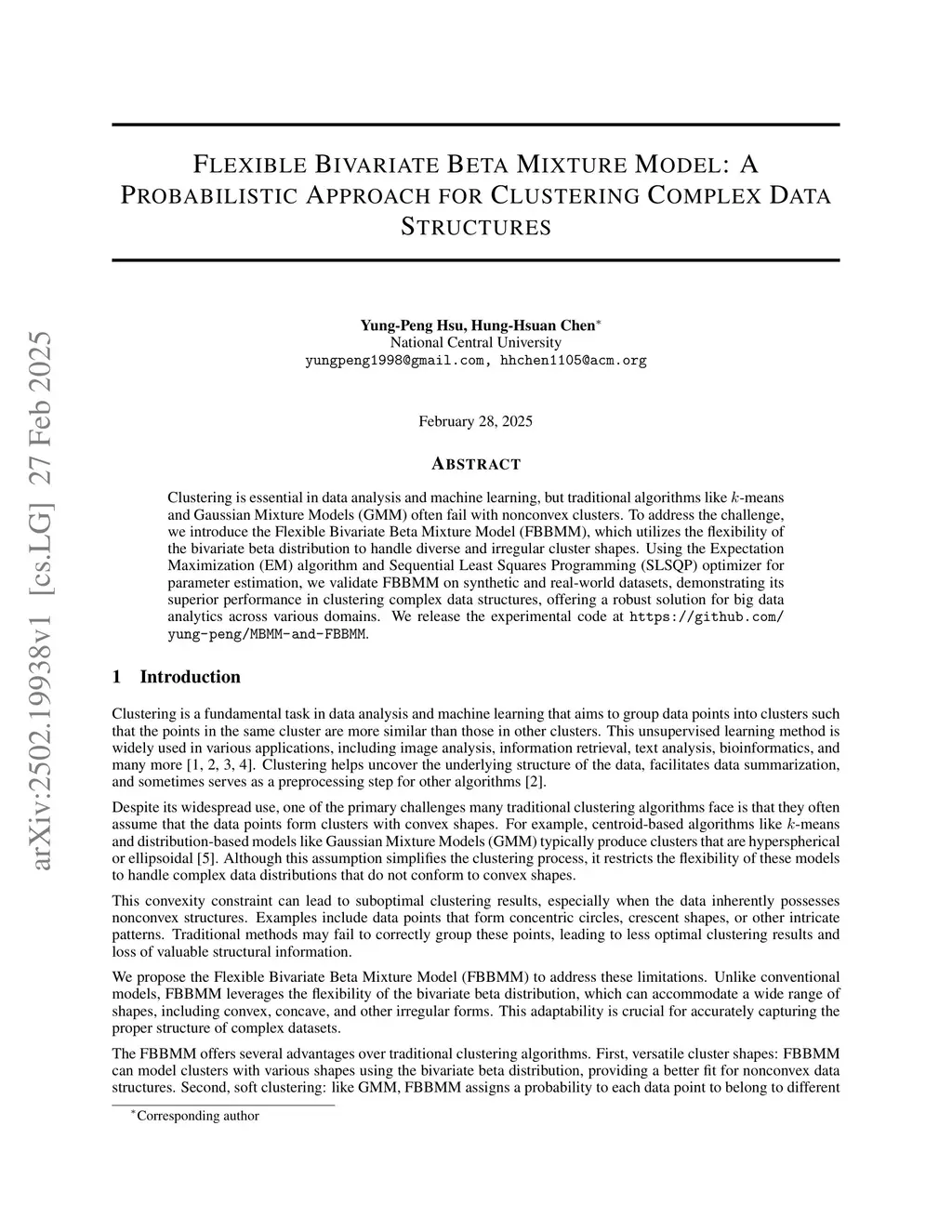 Clustering is essential in data analysis and machine learning, but traditional algorithms like -means and Gaussian Mixture Models (GMM) often fail with nonconvex clusters. To address the challenge, we introduce the Flexible Bivariate Beta Mixture Model (FBBMM), which utilizes the flexibility of the bivariate beta distribution to handle diverse and irregular cluster shapes. Using the Expectation Maximization (EM) algorithm and Sequential Least Squares Programming (SLSQP) optimizer for parameter estimation, we validate FBBMM on synthetic and real-world datasets, demonstrating its superior performance in clustering complex data structures, offering a robust solution for big data analytics across various domains. We release the experimental code atthis https URL.