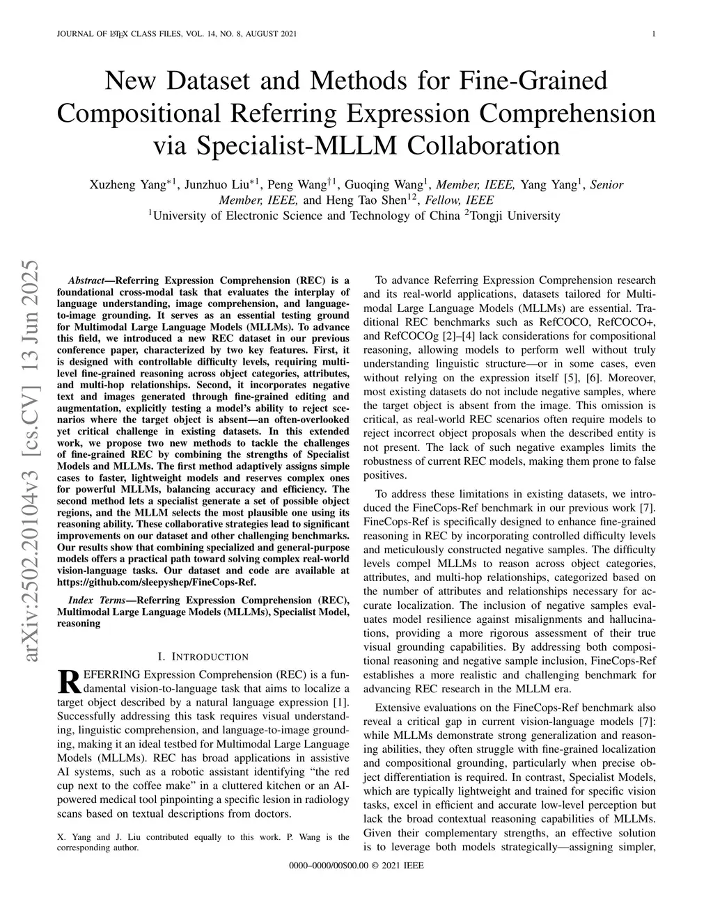 Referring Expression Comprehension (REC) is a foundational cross-modal task that evaluates the interplay of language understanding, image comprehension, and language-to-image grounding. It serves as an essential testing ground for Multimodal Large Language Models (MLLMs). To advance this field, we introduced a new REC dataset in our previous conference paper, characterized by two key features. First, it is designed with controllable difficulty levels, requiring multi-level fine-grained reasoning across object categories, attributes, and multi-hop relationships. Second, it incorporates negative text and images generated through fine-grained editing and augmentation, explicitly testing a model's ability to reject scenarios where the target object is absent, an often overlooked yet critical challenge in existing datasets. In this extended work, we propose two new methods to tackle the challenges of fine-grained REC by combining the strengths of Specialist Models and MLLMs. The first method adaptively assigns simple cases to faster, lightweight models and reserves complex ones for powerful MLLMs, balancing accuracy and efficiency. The second method lets a specialist generate a set of possible object regions, and the MLLM selects the most plausible one using its reasoning ability. These collaborative strategies lead to significant improvements on our dataset and other challenging benchmarks. Our results show that combining specialized and general-purpose models offers a practical path toward solving complex real-world vision-language tasks. Our dataset and code are available atthis https URL.