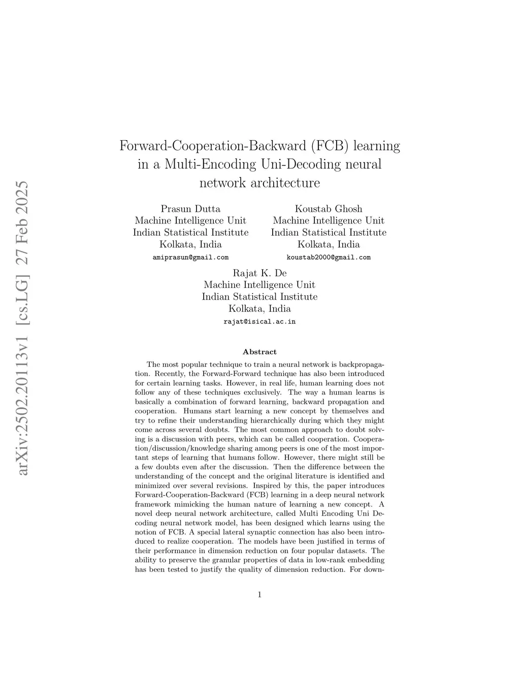 The most popular technique to train a neural network is backpropagation. Recently, the Forward-Forward technique has also been introduced for certain learning tasks. However, in real life, human learning does not follow any of these techniques exclusively. The way a human learns is basically a combination of forward learning, backward propagation and cooperation. Humans start learning a new concept by themselves and try to refine their understanding hierarchically during which they might come across several doubts. The most common approach to doubt solving is a discussion with peers, which can be called cooperation. Cooperation/discussion/knowledge sharing among peers is one of the most important steps of learning that humans follow. However, there might still be a few doubts even after the discussion. Then the difference between the understanding of the concept and the original literature is identified and minimized over several revisions. Inspired by this, the paper introduces Forward-Cooperation-Backward (FCB) learning in a deep neural network framework mimicking the human nature of learning a new concept. A novel deep neural network architecture, called Multi Encoding Uni Decoding neural network model, has been designed which learns using the notion of FCB. A special lateral synaptic connection has also been introduced to realize cooperation. The models have been justified in terms of their performance in dimension reduction on four popular datasets. The ability to preserve the granular properties of data in low-rank embedding has been tested to justify the quality of dimension reduction. For downstream analyses, classification has also been performed. An experimental study on convergence analysis has been performed to establish the efficacy of the FCB learning strategy.