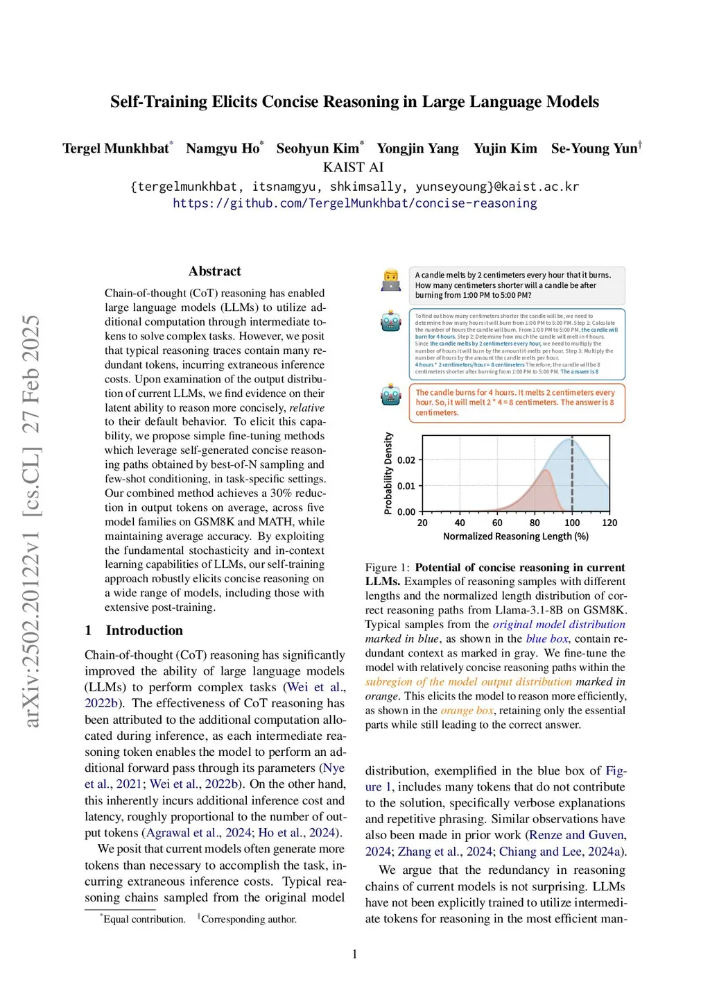 Chain-of-thought (CoT) reasoning has enabled large language models (LLMs) to utilize additional computation through intermediate tokens to solve complex tasks. However, we posit that typical reasoning traces contain many redundant tokens, incurring extraneous inference costs. Upon examination of the output distribution of current LLMs, we find evidence on their latent ability to reason more concisely, relative to their default behavior. To elicit this capability, we propose simple fine-tuning methods which leverage self-generated concise reasoning paths obtained by best-of-N sampling and few-shot conditioning, in task-specific settings. Our combined method achieves a 30% reduction in output tokens on average, across five model families on GSM8K and MATH, while maintaining average accuracy. By exploiting the fundamental stochasticity and in-context learning capabilities of LLMs, our self-training approach robustly elicits concise reasoning on a wide range of models, including those with extensive post-training. Code is available atthis https URL
