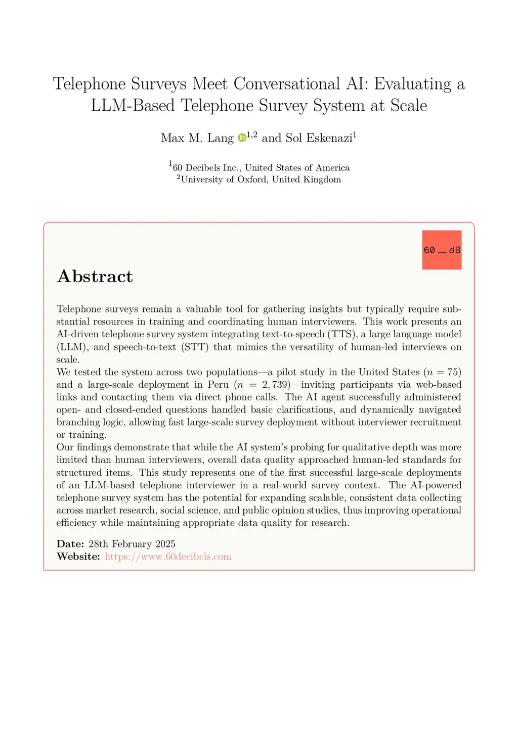 Telephone surveys remain a valuable tool for gathering insights but typically require substantial resources in training and coordinating human interviewers. This work presents an AI-driven telephone survey system integrating text-to-speech (TTS), a large language model (LLM), and speech-to-text (STT) that mimics the versatility of human-led interviews (full-duplex dialogues) at scale.We tested the system across two populations, a pilot study in the United States (n = 75) and a large-scale deployment in Peru (n = 2,739), inviting participants via web-based links and contacting them via direct phone calls. The AI agent successfully administered open-ended and closed-ended questions, handled basic clarifications, and dynamically navigated branching logic, allowing fast large-scale survey deployment without interviewer recruitment or training.Our findings demonstrate that while the AI system's probing for qualitative depth was more limited than human interviewers, overall data quality approached human-led standards for structured items. This study represents one of the first successful large-scale deployments of an LLM-based telephone interviewer in a real-world survey context. The AI-powered telephone survey system has the potential for expanding scalable, consistent data collecting across market research, social science, and public opinion studies, thus improving operational efficiency while maintaining appropriate data quality for research.