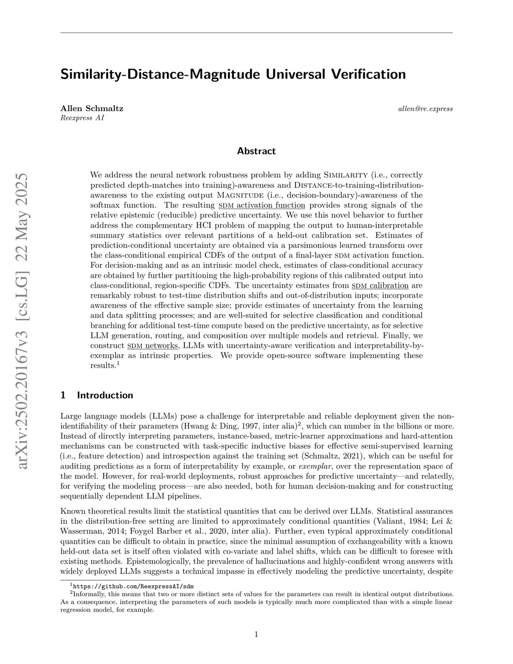 We address the neural network robustness problem by adding Similarity (i.e., correctly predicted depth-matches into training)-awareness and Distance-to-training-distribution-awareness to the existing output Magnitude (i.e., decision-boundary)-awareness of the softmax function. The resulting SDM activation function provides strong signals of the relative epistemic (reducible) predictive uncertainty. We use this novel behavior to further address the complementary HCI problem of mapping the output to human-interpretable summary statistics over relevant partitions of a held-out calibration set. Estimates of prediction-conditional uncertainty are obtained via a parsimonious learned transform over the class-conditional empirical CDFs of the output of a final-layer SDM activation function. For decision-making and as an intrinsic model check, estimates of class-conditional accuracy are obtained by further partitioning the high-probability regions of this calibrated output into class-conditional, region-specific CDFs. The uncertainty estimates from SDM calibration are remarkably robust to test-time distribution shifts and out-of-distribution inputs; incorporate awareness of the effective sample size; provide estimates of uncertainty from the learning and data splitting processes; and are well-suited for selective classification and conditional branching for additional test-time compute based on the predictive uncertainty, as for selective LLM generation, routing, and composition over multiple models and retrieval. Finally, we construct SDM networks, LLMs with uncertainty-aware verification and interpretability-by-exemplar as intrinsic properties. We provide open-source software implementing these results.