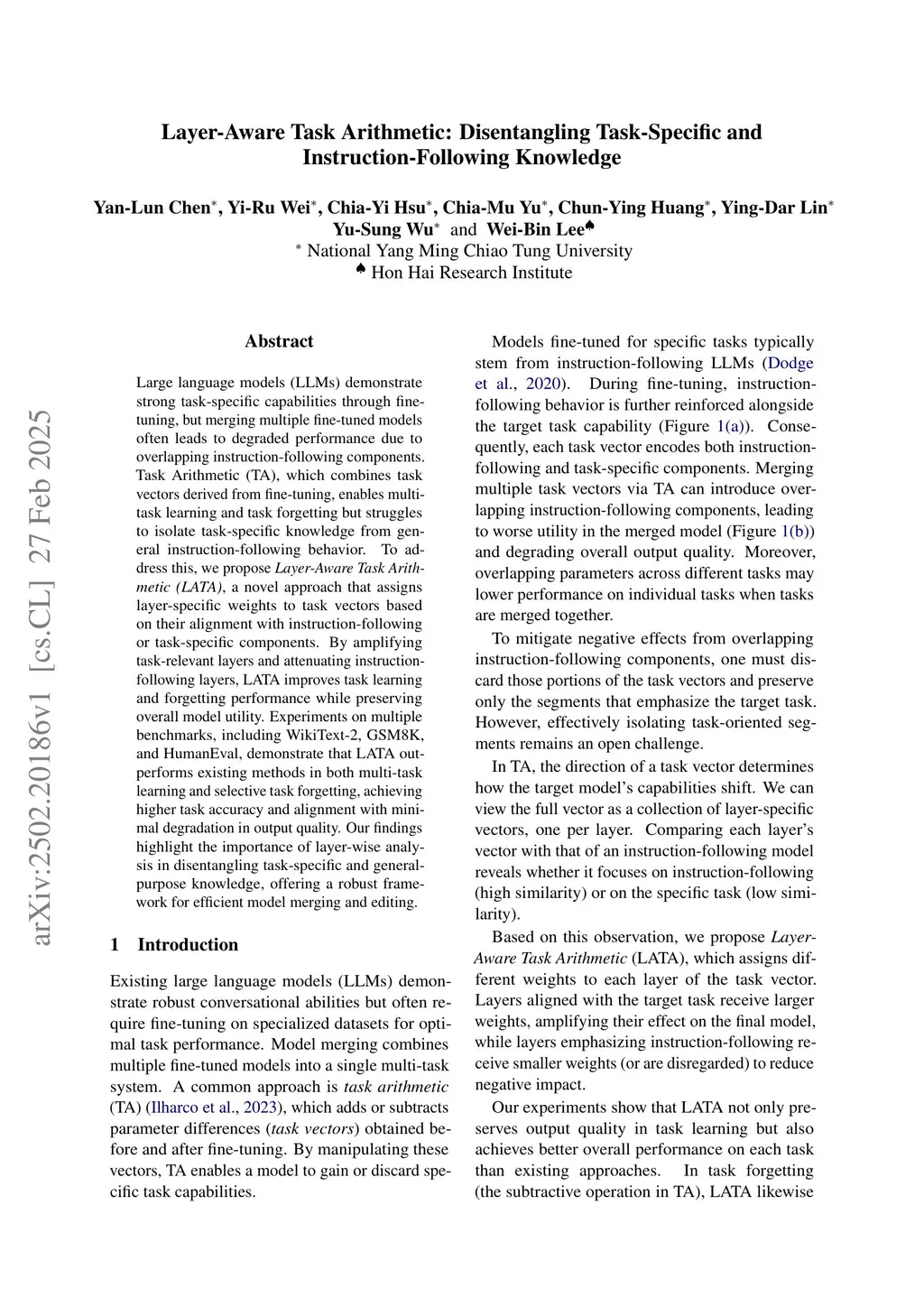 Large language models (LLMs) demonstrate strong task-specific capabilities through fine-tuning, but merging multiple fine-tuned models often leads to degraded performance due to overlapping instruction-following components. Task Arithmetic (TA), which combines task vectors derived from fine-tuning, enables multi-task learning and task forgetting but struggles to isolate task-specific knowledge from general instruction-following behavior. To address this, we propose Layer-Aware Task Arithmetic (LATA), a novel approach that assigns layer-specific weights to task vectors based on their alignment with instruction-following or task-specific components. By amplifying task-relevant layers and attenuating instruction-following layers, LATA improves task learning and forgetting performance while preserving overall model utility. Experiments on multiple benchmarks, including WikiText-2, GSM8K, and HumanEval, demonstrate that LATA outperforms existing methods in both multi-task learning and selective task forgetting, achieving higher task accuracy and alignment with minimal degradation in output quality. Our findings highlight the importance of layer-wise analysis in disentangling task-specific and general-purpose knowledge, offering a robust framework for efficient model merging and editing.